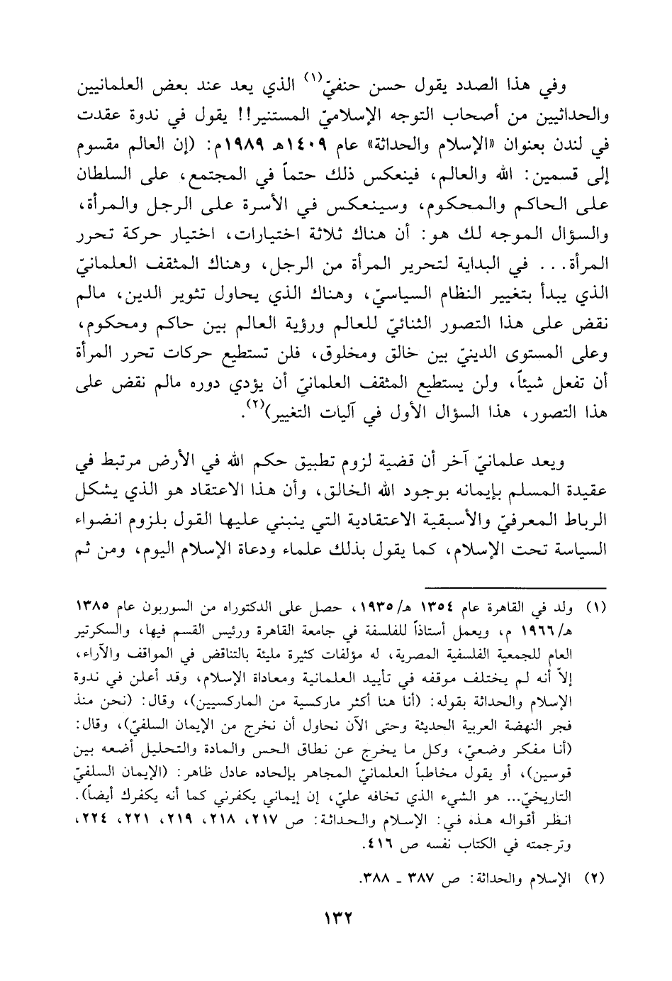 وفي هذا الصدد يقول حسن حنفيّ (¬١) الذي يعد عند بعض العلمانيين والحداثيين من أصحاب التوجه الإسلامي المستنير! ! يقول في ندوة عقدت في لندن بعنوان "الإسلام والحداثة" عام ١٤٠٩ هـ/ ١٩٨٩ م: (إن العالم مقسوم إلى قسمين: اللَّه والعالم، فينعكس ذلك حتمًا في المجتمع، على السلطان على الحاكم والمحكوم، وسينعكس في الأسرة على الرجل والمرأة، والسؤال الموجه لك هو: أن هناك ثلاثة اختيارات، اختيار حركة تحرر المرأة. . . في البداية لتحرير المرأة من الرجل، وهناك المثقف العلماني الذي يبدأ بتغيير النظام السياسيّ، وهناك الذي يحاول تثوير الدين، ما لم نقض على هذا التصور الثنائي للعالم ورؤية العالم بين حاكم ومحكوم، وعلى المستوى الدينيّ بين خالق ومخلوق، فلن تستطيع حركات تحرر المرأة أن تفعل شيئًا، ولن يستطيع المثقف العلمانيّ أن يؤدي دوره ما لم نقض على هذا التصور، هذا السؤال الأول في آليات التغيير) (¬٢).