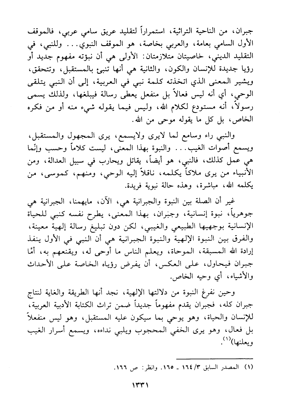 جبران، من الناحية التراثية، استمرارًا لتقليد عريق سامي عربي، فالموقف الأول السامي بعامة، والعربي بخاصة، هو الموقف النبوي. . . وللنبي، في التقليد الديني، خاصيتان متلازمتان: الأولى هي أن نبؤته مفهوم جديد أو رؤيا جديدة للإنسان والكون، والثانية هي أنها تنبئ بالمستقبل، وتتحقق، ويشير المعنى الذي اتخذته كلمة نبي في العربية، إلى أن النبي يتلقى الوحي، أي أنه ليس فعالًا بل منفعل يعطى رسالة فيبلغها، ولذلك يسمى رسولًا، أنه مستودع لكلام اللَّه، وليس فيما يقوله شيء منه أو من فكره الخاص، بل كل ما يقوله موحى من اللَّه.