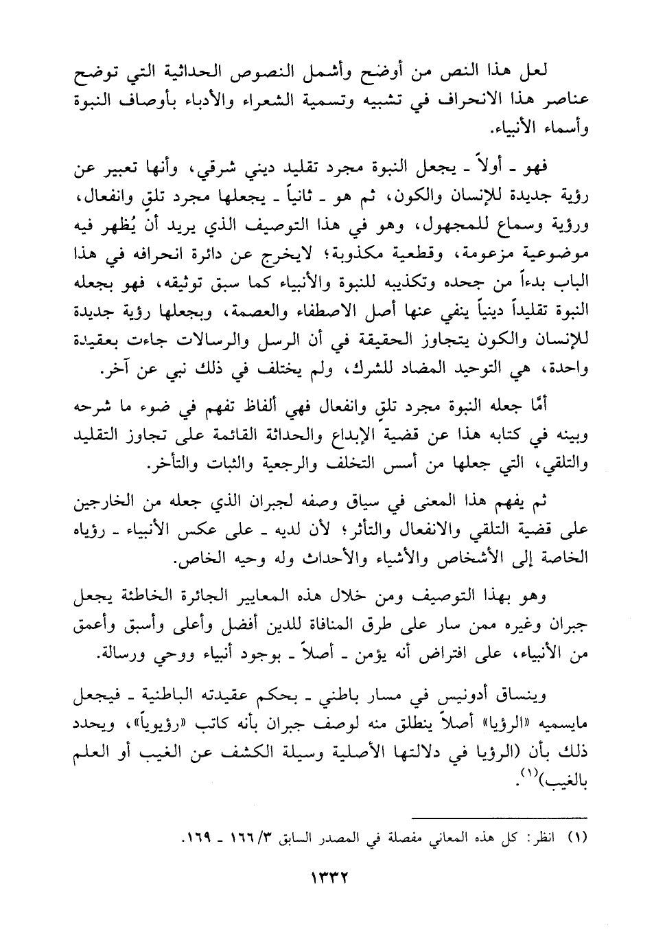 ثم يفهم هذا المعنى في سياق وصفه لجبران الذي جعله من الخارجين على قضية التلقي والانفعال والتأثر؛ لأن لديه -على عكس الأنبياء- رؤياه الخاصة إلى الأشخاص والأشياء والأحداث وله وحيه الخاص.
