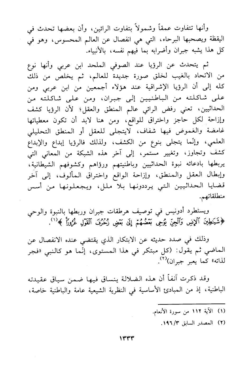 ويستطرد أدونيس في توصيف هرطقات جبران وربطها بالنبوة والوحي {شَيَاطِينَ الْإِنْسِ وَالْجِنِّ يُوحِي بَعْضُهُمْ إِلَى بَعْضٍ زُخْرُفَ الْقَوْلِ غُرُورًا} (¬١).
