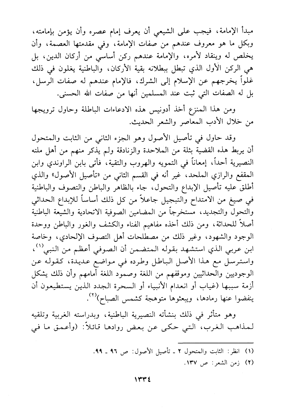 وقد حاول في تأصيل الأصول وهو الجزء الثاني من الثابت والمتحول أن يربط هذه القضية بثلة من الملاحدة والزنادقة ولم يذكر منهم من أهل ملته النصيرية أحدًا، إمعانًا في التمويه والهروب والتقية، فأتى بابن الراوندي وابن المقفع والرازي الملحد، غير أنه في القسم الثاني من "تأصيل الأصول" والذي أطلق عليه تأصيل الإبداع والتحول، جاء بالظاهر والباطن والتصوف والباطنية في صيغ من الامتداح والتبجيل جاعلًا من كل ذلك أساسًا للإبداع الحداثي والتحول والتجديد، مستخرجًا من المضامين الصوفية الاتحادية والشيعة الباطنية أصلًا للحداثة، ومن ذلك أخذه مفاهيم الفناء والكشف والغور والباطن ووحدة الوجود والشهود، وغير ذلك من مصطلحات أهل التصوف الإلحادي، وخاصة ابن عربي الذي استشهد بقوله المتضمن أن الصوفي أعظم من النبي (¬١)، واسترسل مع هذا الأصل الباطل وطرده في مواضع عديدة، كقوله عن الوجوديين والحداثيين وموقفهم من اللغة وصمود اللغة أمامهم وأن ذلك يشكل أزمة سببها (غياب أو انعدام الأنبياء أو السحرة الجدد الذين يستطيعون أن ينفضوا عنها رمادها، ويبعثوها متوهجة كشمس الصباح) (¬٢).