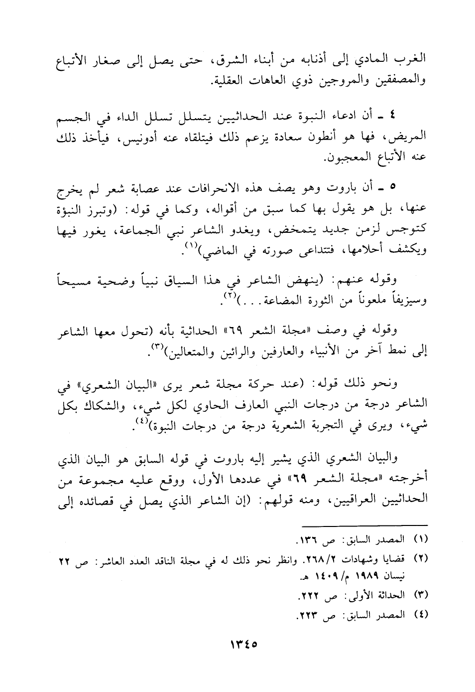 وقوله في وصف "مجلة الشعر ٦٩" الحداثية بأنه (تحول معها الشاعر إلى نمط آخر من الأنبياء والعارفين والرائين والمتعالين) (¬٣).