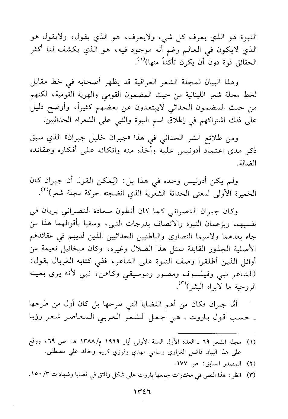 وهذا البيان لمجلة الشعر العراقية قد يظهر أصحابه في خط مقابل لخط مجلة شعر اللبنانية من حيث المضمون القومي والهوية القومية، لكنهم من حيث المضمون الحداثي لا يبتعدون عن بعضهم كثيرًا، وأوضح دليل على ذلك اشتراكهم في إطلاق اسم النبوة والنبي على الشعراء الحداثيين.