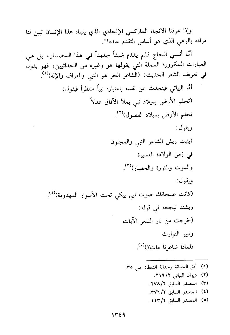 أمَّا أنسي الحاج فلم يقدم شيئًا جديدًا في هذا المضمار، بل هي العبارات المكرورة المملة التي يقولها هو وغيره من الحداثيين، فهو يقول في تعريف الشعر الحديث: (الشاعر الحر هو النبي والعراف والإله) (¬١).