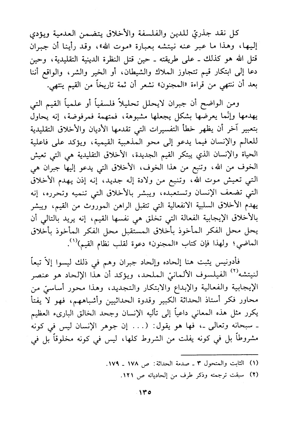 فأدونيس يثبت هنا إلحاده وإلحاد جبران وهم في ذلك ليسوا إلّا تبعًا لنيتشه (¬٢) الفيلسوف الألمانيّ الملحد، ويؤكد أن هذا الإلحاد هو عنصر الإيجابية والفعالية والإبداع والابتكار والتجديد، وهذا محور أساسي من محاور فكر أستاذ الحداثة الكبير وقدوة الحداثيين وأشباههم، فهو لا يفتأ يكرر مثل هذه المعاني داعيًا إلى تأليه الإنسان وجحد الخالق البارئ العظيم -سبحانه وتعالى-، فها هو يقول: (. . . إن جوهر الإنسان ليس في كونه مشروطًا بل في كونه يفلت من الشروط كلها، ليس في كونه مخلوقًا بل في