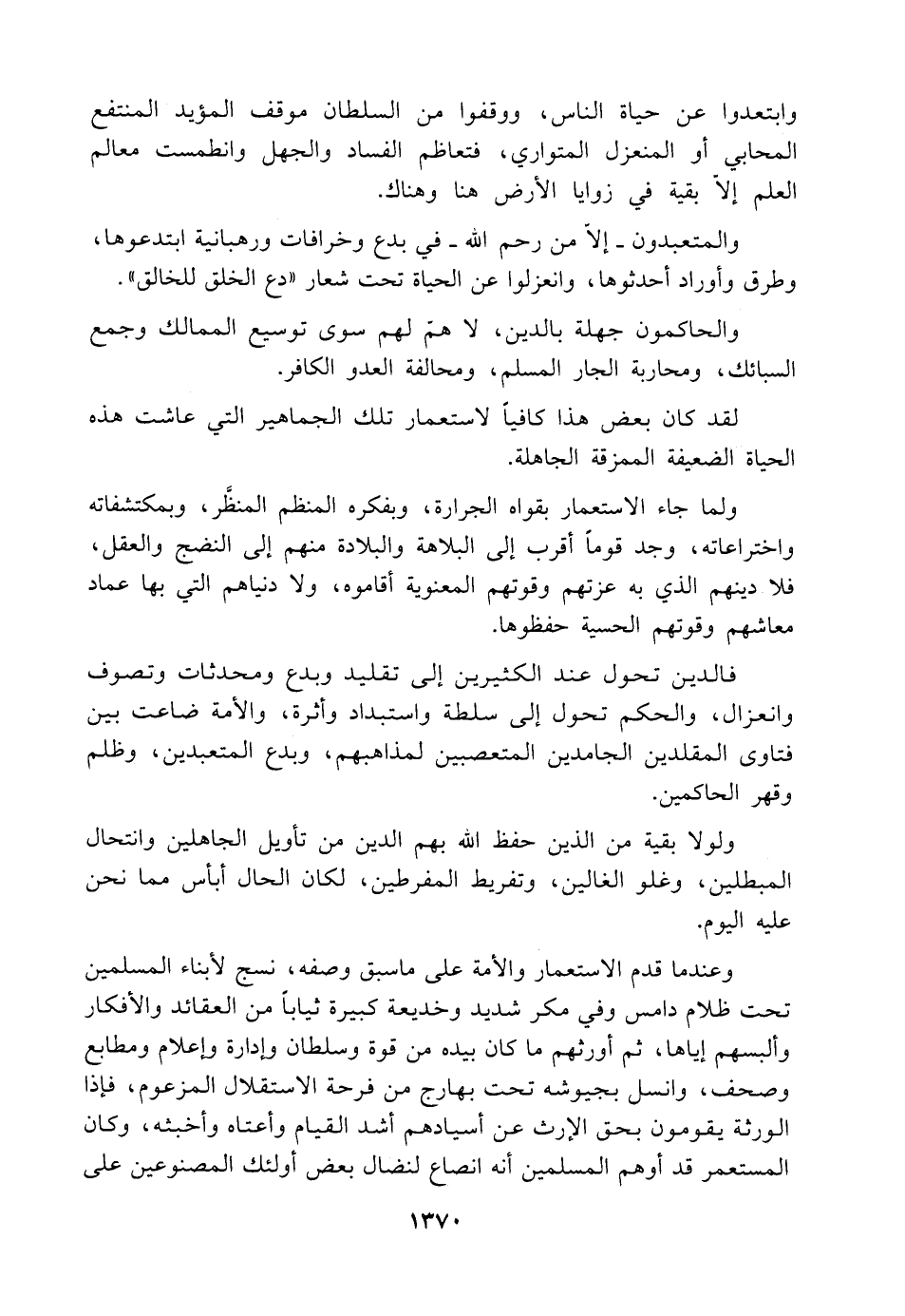 ولما جاء الاستعمار بقواه الجرارة، وبفكره المنظم المنطر، وبمكتشفاته واختراعاته، وجد قومًا أقرب إلى البلاهة والبلادة منهم إلى النضج والعقل، فلا دينهم الذي به عزتهم وقوتهم المعنوية أقاموه، ولا دنياهم التي بها عماد معاشهم وقوتهم الحسية حفظوها.