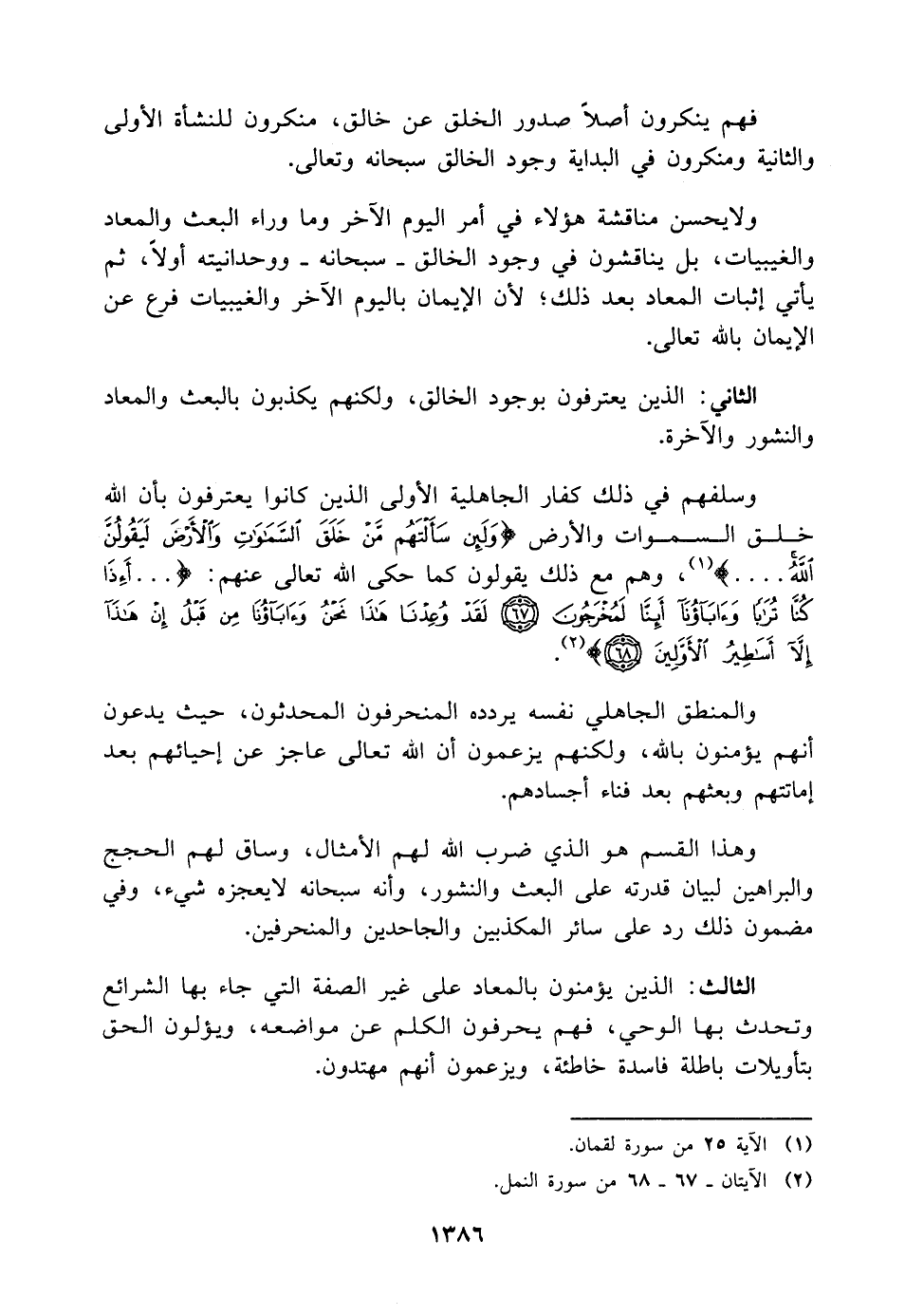 وهذا القسم هو الذي ضرب اللَّه لهم الأمثال، وساق لهم الحجج والبراهين لبيان قدرته على البعث والنشور، وأنه سبحانه لا يعجزه شيء، وفي مضمون ذلك رد على سائر المكذبين والجاحدين والمنحرفين.