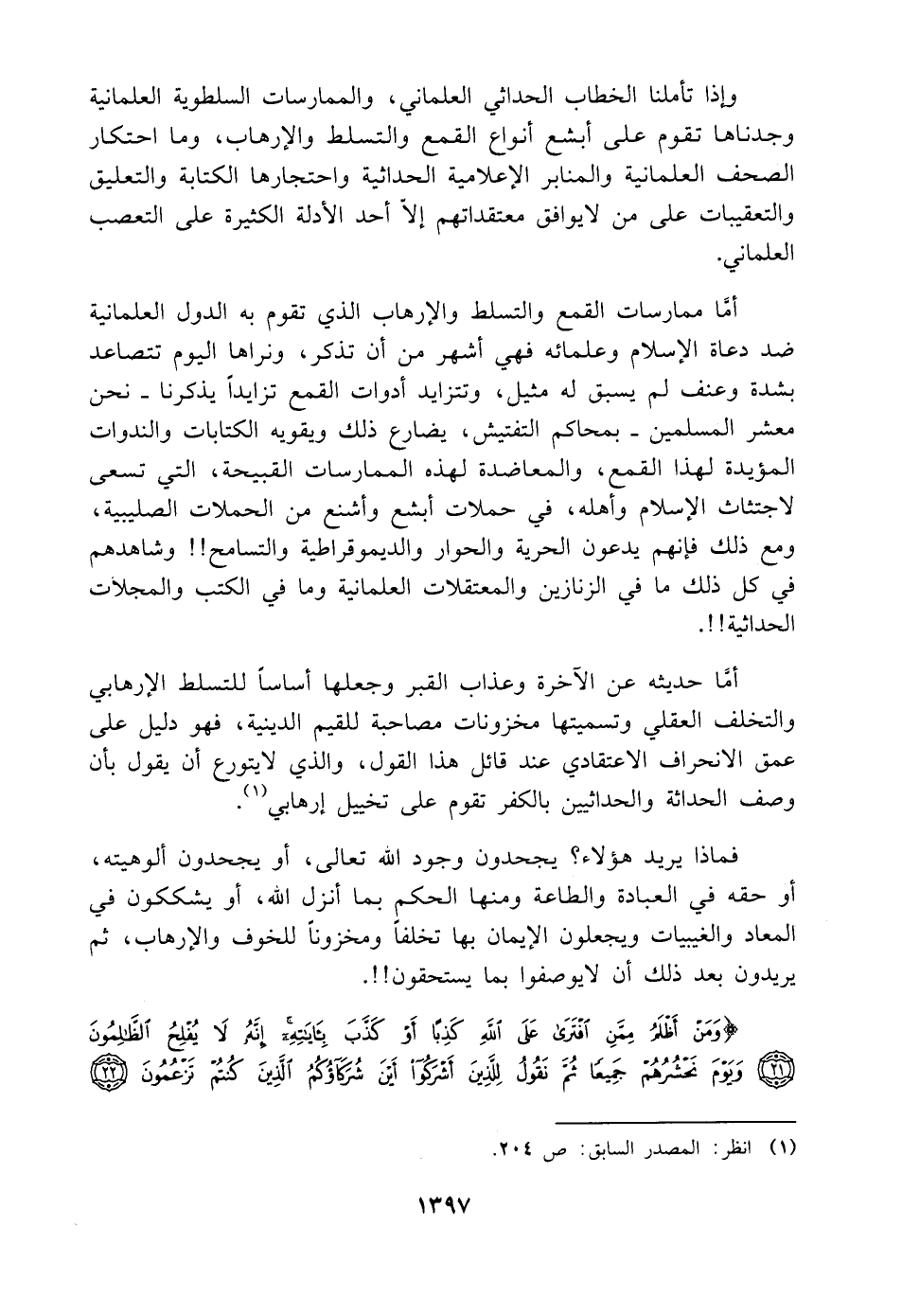 أمَّا حديثه عن الآخرة وعذاب القبر وجعلها أساسًا للتسلط الإرهابي والتخلف العقلي وتسميتها مخزونات مصاحبة للقيم الدينية، فهو دليل على عمق الانحراف الاعتقادي عند قائل هذا القول، والذي لا يتورع أن يقول بأن وصف الحداثة والحداثيين بالكفر تقوم على تخييل إرهابي (¬١).