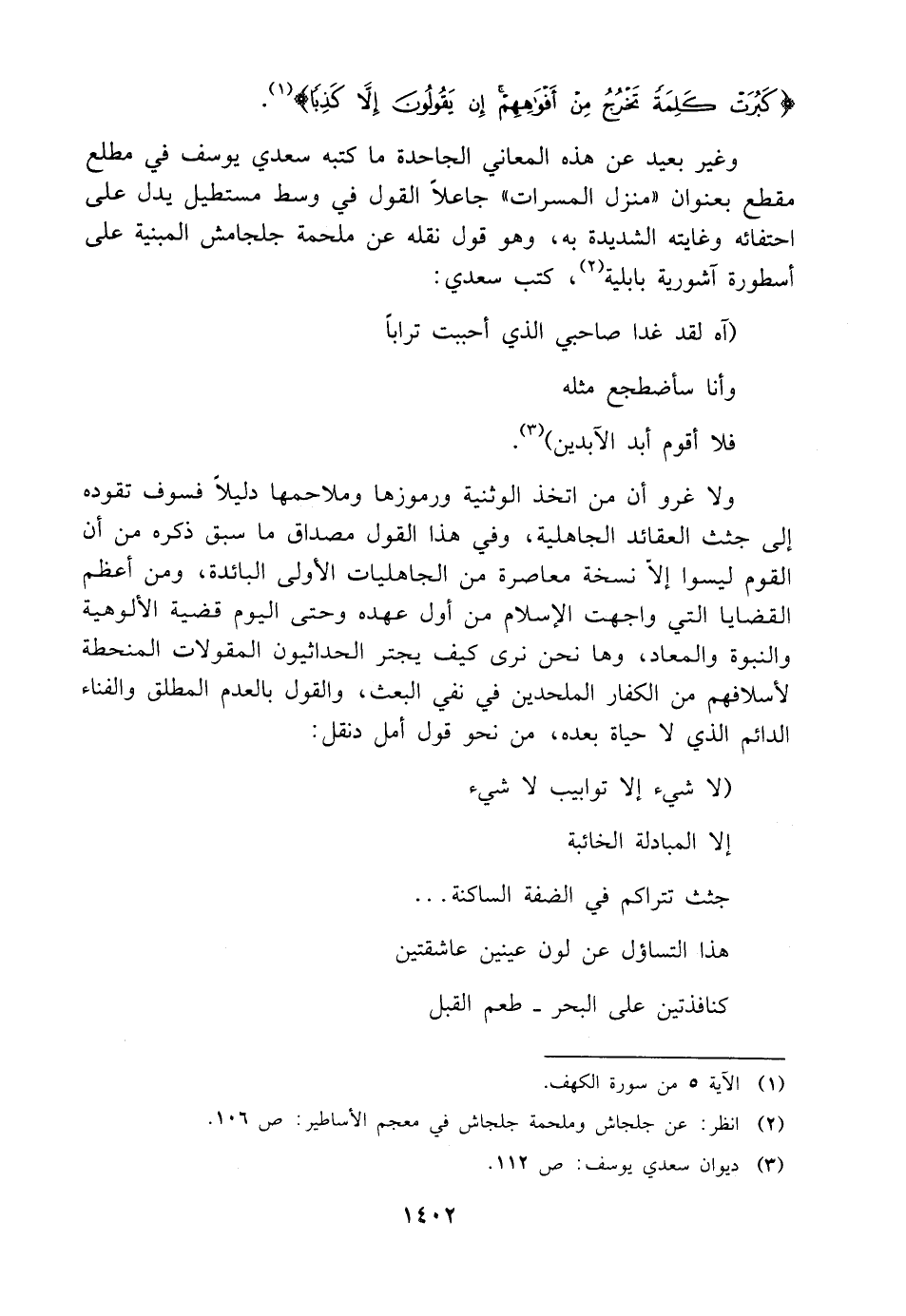 ولا غرو أن من اتخذ الوثنية ورموزها وملاحمها دليلًا فسوف تقوده إلى جثث العقائد الجاهلية، وفي هذا القول مصداق ما سبق ذكره من أن القوم ليسوا إلّا نسخة معاصرة من الجاهليات الأولى البائدة، ومن أعظم القضايا التي واجهت الإسلام من أول عهده وحتى اليوم قضية الألوهية والنبوة والمعاد، وها نحن نرى كيف يجتر الحداثيون المقولات المنحطة لأسلافهم من الكفار الملحدين في نفي البعث، والقول بالعدم المطلق والفناء الدائم الذي لا حياة بعده، من نحو قول أمل دنقل: