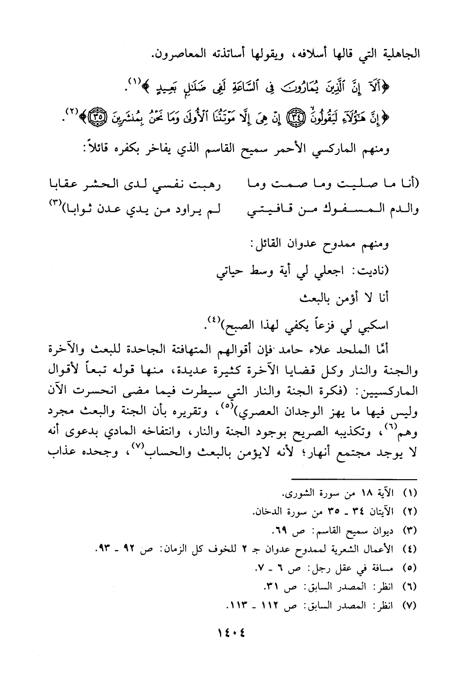 أمَّا الملحد علاء حامد فإن أقوالهم المتهافتة الجاحدة للبعث والآخرة والجنة والنار وكل قضايا الآخرة كثيرة عديدة، منها قوله تبعًا لأقوال الماركسيين: (فكرة الجنة والنار التي سيطرت فيما مضى انحسرت الآن وليس فيها ما يهز الوجدان العصري) (¬٥)، وتقريره بأن الجنة والبعث مجرد وهم (¬٦)، وتكذيبه الصريح بوجود الجنة والنار، وانتفاخه المادي بدعوى أنه لا يوجد مجتمع أنهار؛ لأنه لا يؤمن بالبعث والحساب (¬٧)، وجحده عذاب