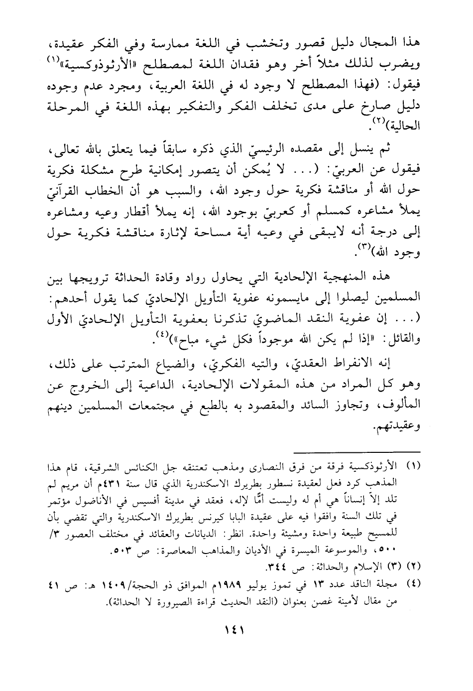 \هذا المجال دليل قصور وتخشب في اللغة ممارسة وفي الفكر عقيدة، ويضرب لذلك مثلًا أخر وهو فقدان اللغة لمصطلح "الأرثوذوكسية" (¬١) فيقول: (فهذا المصطلح لا وجود له في اللغة العربية، ومجرد عدم وجوده دليل صارخ على مدى تخلف الفكر والتفكير بهذه اللغة في المرحلة الحالية) (¬٢).