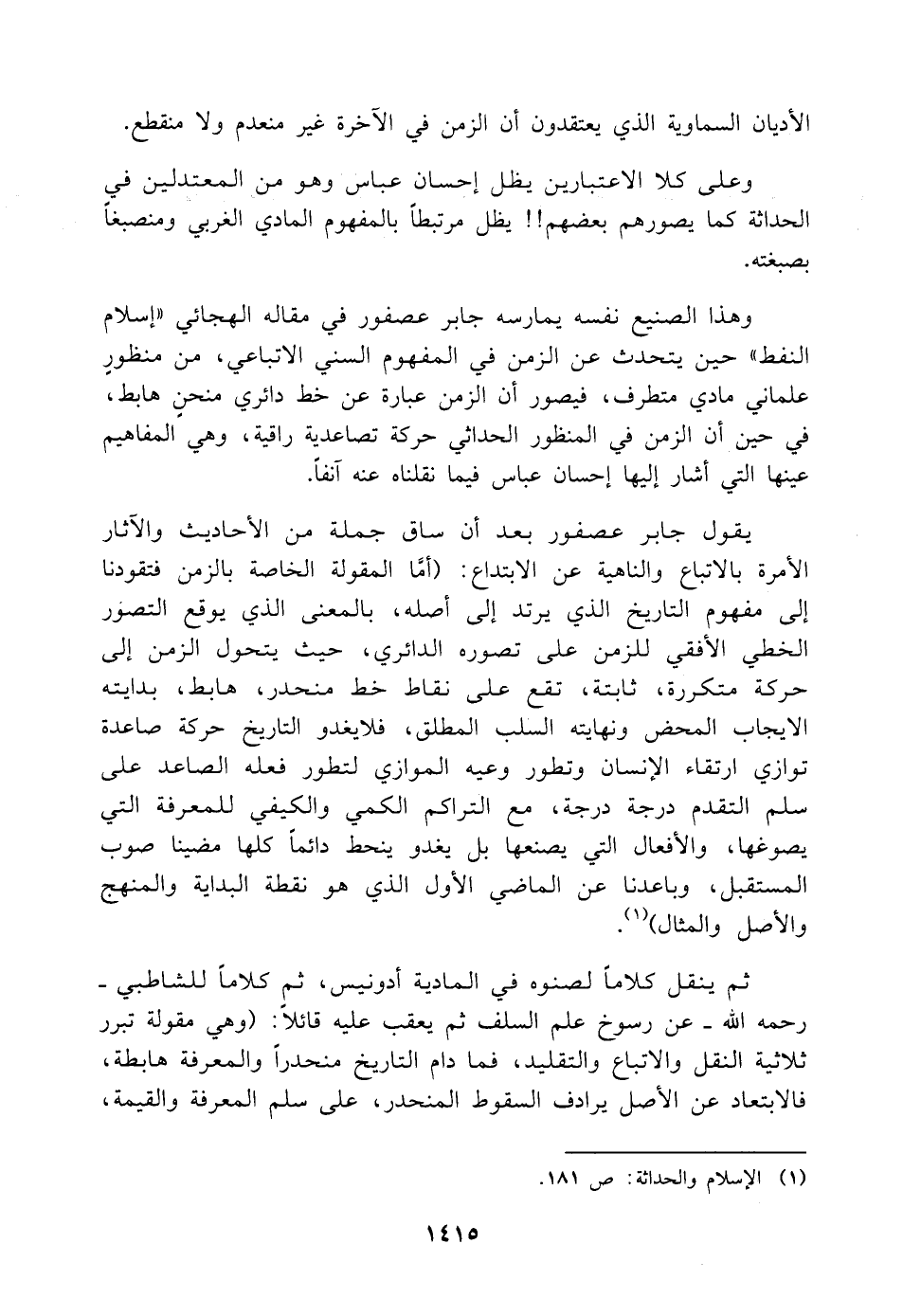 وهذا الصنيع نفسه يمارسه جابر عصفور في مقاله الهجائي "إسلام النفط" حين يتحدث عن الزمن في المفهوم السني الاتباعي، من منظورٍ علماني مادي متطرف، فيصور أن الزمن عبارة عن خط دائري منحنٍ هابط، في حين أن الزمن في المنظور الحداثي حركة تصاعدية راقية، وهي المفاهيم عينها التي أشار إليها إحسان عباس فيما نقلناه عنه آنفًا.