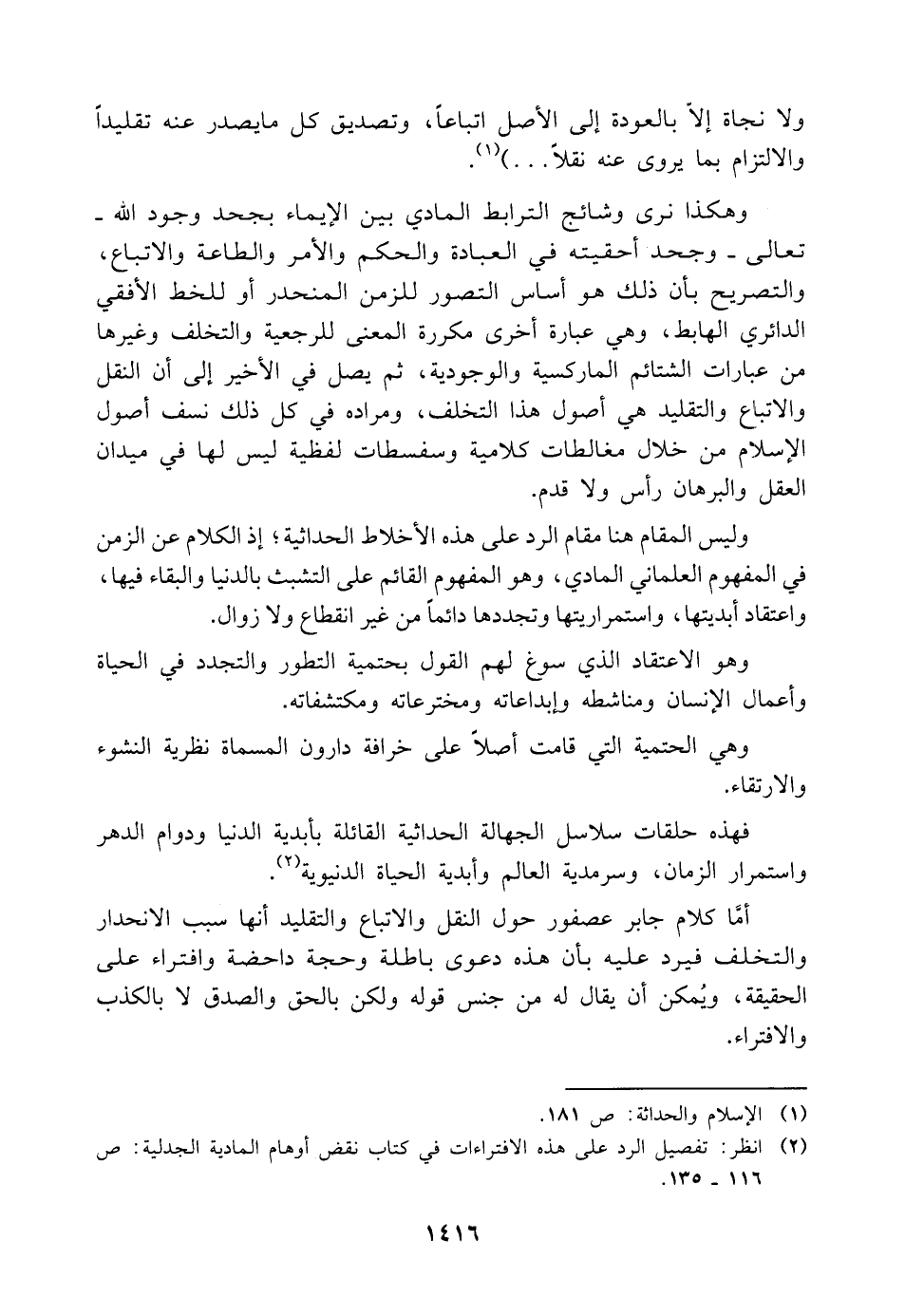 وهكذا نرى وشائج الترابط المادي بين الإيماء بجحد وجود اللَّه -تعالى- وجحد أحقيته في العبادة والحكم والأمر والطاعة والاتباع، والتصريح بأن ذلك هو أساس التصور للزمن المنحدر أو للخط الأفقي الدائري الهابط، وهي عبارة أخرى مكررة المعنى للرجعية والتخلف وغيرها من عبارات الشتائم الماركسية والوجودية، ثم يصل في الأخير إلى أن النقل والاتباع والتقليد هي أصول هذا التخلف، ومراده في كل ذلك نسف أصول الإسلام من خلال مغالطات كلامية وسفسطات لفظية ليس لها في ميدان العقل والبرهان رأس ولا قدم.