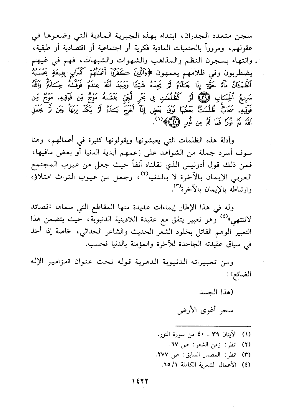 وله في هذا الإطار إيماءات عديدة منها المقاطع التي سماها "قصائد لا تنتهي" (¬٤) وهو تعبير يتفق مع عقيدة اللادينية الدنيوية، حيث يتضمن هذا التعبير الوهم القائل بخلود الشعر الحديث والشاعر الحداثي، خاصة إذا أخذ في سياق عقيدته الجاحدة للآخرة والمؤمنة بالدنيا فحسب.