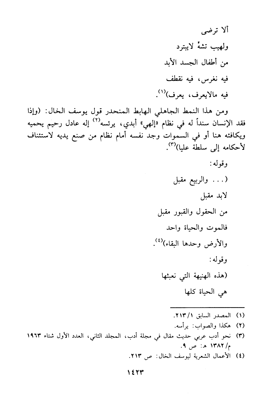 ومن هذا النمط الجاهلي الهابط المنحدر قول يوسف الخال: (وإذا فقد الإنسان سندًا له في نظام "إلهي" أبدي، يرئسه (¬٢) إله عادل رحيم يحميه ويكافئه هنا أو في السموات وجد نفسه أمام نظام من صنع يديه لاستئناف لأحكامه إلى سلطة عليا) (¬٣).