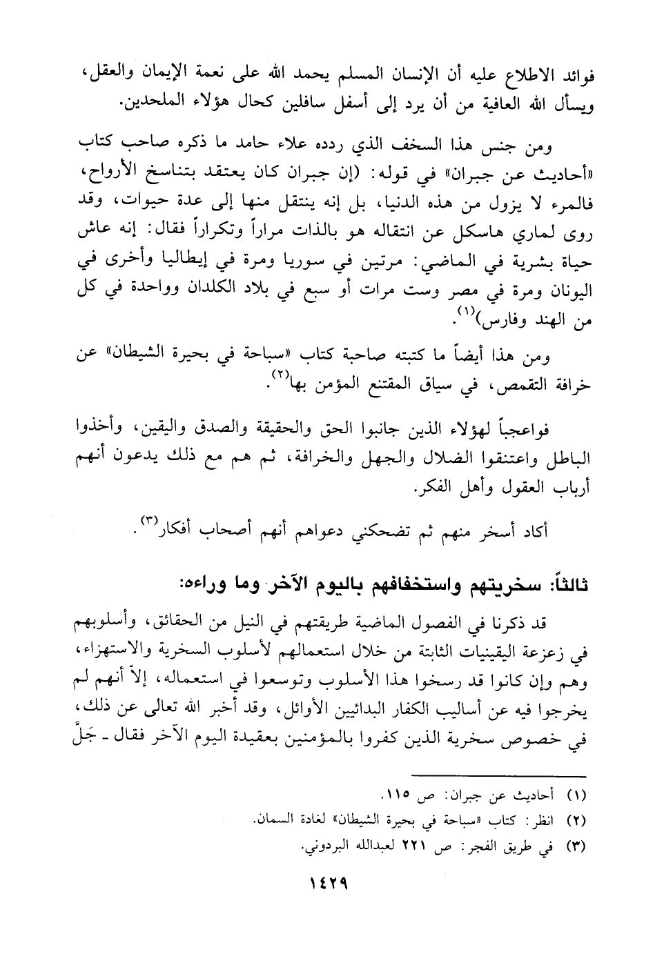 ومن جنس هذا السخف الذي ردده علاء حامد ما ذكره صاحب كتاب "أحاديث عن جبران" في قوله: (إن جبران كان يعتقد بتناسخ الأرواح، فالمرء لا يزول من هذه الدنيا، بل إنه ينتقل منها إلى عدة حيوات، وقد روى لماري هاسكل عن انتقاله هو بالذات مرارًا وتكرارًا فقال: إنه عاش حياة بشرية في الماضي: مرتين في سوريا ومرة في إيطاليا وأخرى في اليونان ومرة في مصر وست مرات أو سبع في بلاد الكلدان وواحدة في كل من الهند وفارس) (¬١).