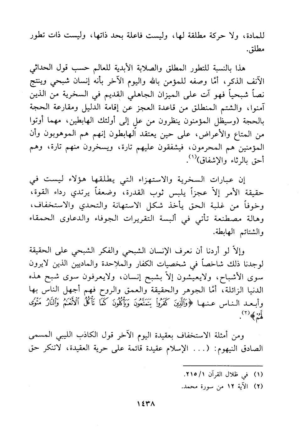 هذا بالنسبة للتطور المطلق والصلابة الأبدية للعالم حسب قول الحداثي الآنف الذكر، أمَّا وصفه للمؤمن باللَّه واليوم الآخر بأنه إنسان شبحي وينتج نصًا شبحيًا فهو آت على الميزان الجاهلي القديم في السخرية من الذين آمنوا، والشتم المنطلق من قاعدة العجز عن إقامة الدليل ومقارعة الحجة بالحجة (وسيظل المؤمنون ينظرون من علٍ إلى أولئك الهابطين، مهما أوتوا من المتاع والأعراض، على حين يعتقد الهابطون إنهم هم الموهوبون وأن المؤمنين هم المحرمون، فيشفقون عليهم تارة، ويسخرون منهم تارة، وهم أحق بالرثاء والإشفاق) (¬١).