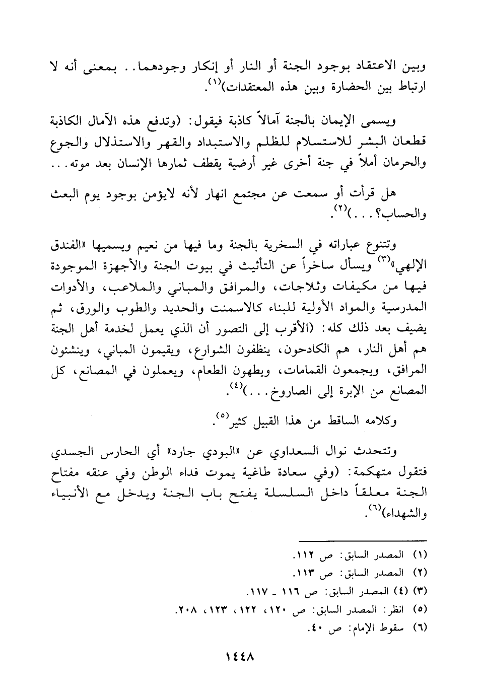 وتتنوع عباراته في السخرية بالجنة وما فيها من نعيم ويسميها "الفندق الإلهي" (¬٣) وبسأل ساخرًا عن التأثيث في بيوت الجنة والأجهزة الموجودة فيها من مكيفات وثلاجات، والمرافق والمباني والملاعب، والأدوات المدرسية والمواد الأولية للبناء كالاسمنت والحديد والطوب والورق، ثم يضيف بعد ذلك كله: (الأقرب إلى التصور أن الذي يعمل لخدمة أهل الجنة هم أهل النار، هم الكادحون، ينظفون الشوارع، ويقيمون المباني، وينشئون المرافق، ويجمعون القمامات، ويطهون الطعام، ويعملون في المصانع، كل المصانع من الإبرة إلى الصاروخ. . .) (¬٤).