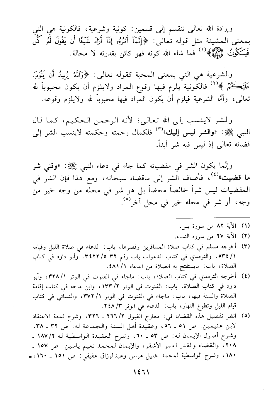 (¬٥) انظر تفصيل هذه القضايا في: معارج القبول ٢/ ٢٦٦ - ٣٢٦، وشرح لمعة الاعتقاد لابن عثيمين: ص ٥١ - ٥٦، وعقيدة أهل السنة والجماعة له: ص ٣٢ - ٣٨، وشرح أصول الإيمان له: ص ٥٣ - ٦٠، وشرح العقيدة الواسطية له ٢/ ١٨٧ - ٢٠٨، والقضاء والقدر لعمر الأشقر، والإيمان لمحمد نعيم ياسين: ص ١٥٧ - ١٨٠، وشرح الواسطية لمحمد خليل هراس وعبد الرزاق عفيفي: ص ١٥١ - ١٦٠، =