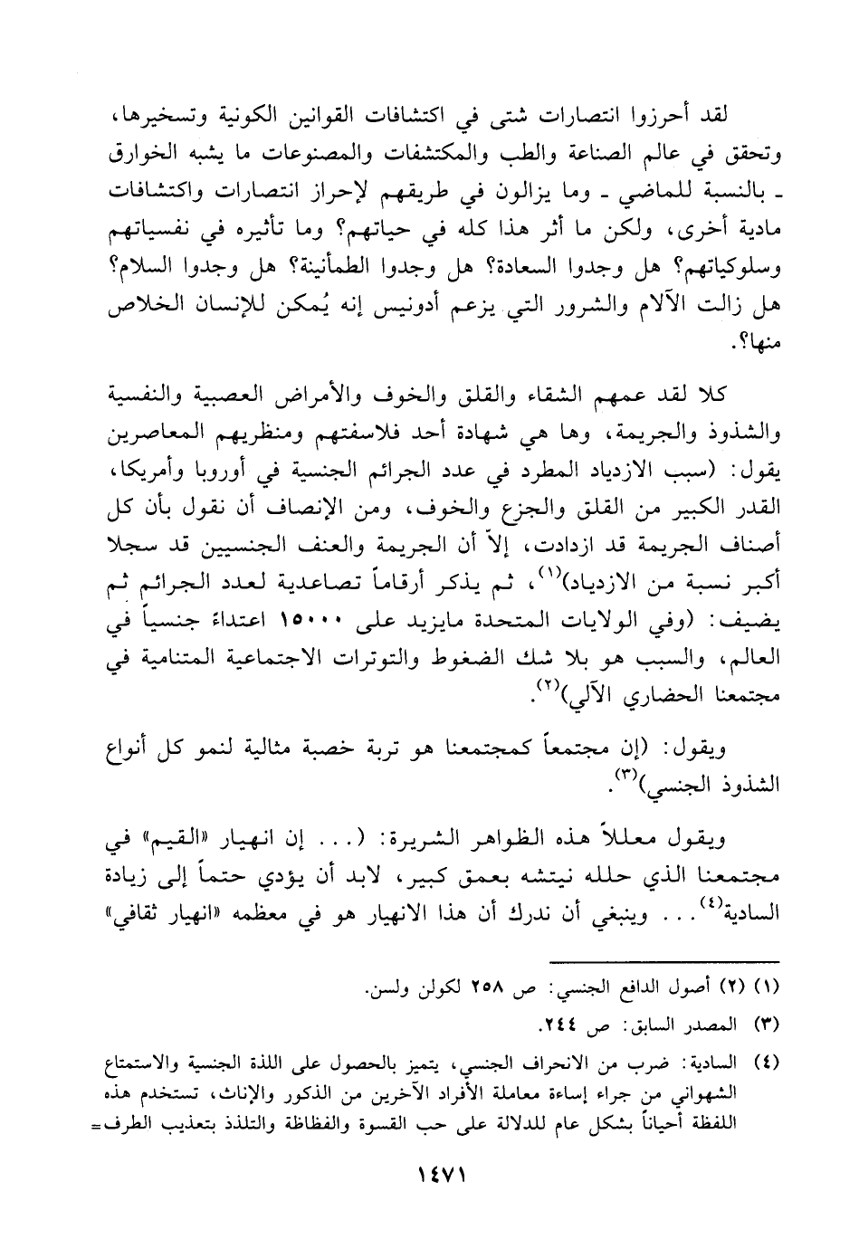 ويقول معللًا هذه الظواهر الشريرة: (. . . إن انهيار "القيم" في مجتمعنا الذي حلله نيتشه بعمق كبير، لا بد أن يؤدي حتمًا إلى زيادة السادية (¬٤). . . وينبغي أن ندرك أن هذا الانهيار هو في معظمه "انهيار ثقافي"