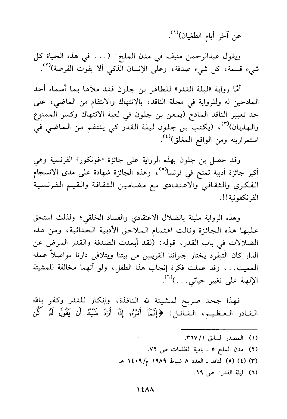 أمَّا رواية "ليلة القدر" للطاهر بن جلون فقد ملأها بما أسماه أحد المادحين له وللرواية في مجلة الناقد، بالانتهاك والانتقام من الماضي، على حد تعبير الناقد المادح (يمعن بن جلون في لعبة الانتهاك وكسر الممنوع والهذيان) (¬٣)، (يكتب بن جلون ليلة القدر كي ينتقم من الماضي في استمراريته ومن الواقع المغلق) (¬٤).