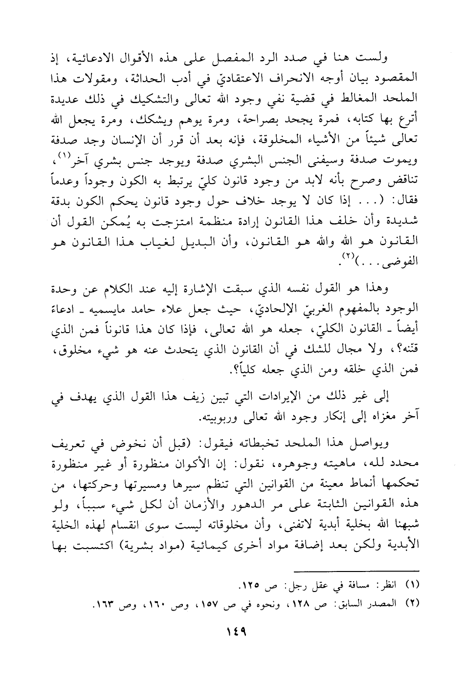 ولست هنا في صدد الرد المفصل على هذه الأقوال الادعائية، إذ المقصود بيان أوجه الانحراف الاعتقاديّ في أدب الحداثة، ومقولات هذا الملحد المغالط في قضية نفي وجود اللَّه تعالى والتشكيك في ذلك عديدة أترع بها كتابه، فمرة يجحد بصراحة، ومرة يوهم ويشكك، ومرة يجعل اللَّه تعالى شيئًا من الأشياء المخلوقة، فإنه بعد أن قرر أن الإنسان وجد صدفة ويموت صدفة وسيفنى الجنس البشري صدفة ويوجد جنس بشري آخر (¬١)، تناقض وصرح بأنه لابد من وجود قانون كلي يرتبط به الكون وجودًا وعدمًا فقال: (. . . إذا كان لا يوجد خلاف حول وجود قانون يحكم الكون بدقة شديدة وأن خلف هذا القانون إرادة منظمة امتزجت به يُمكن القول أن القانون هو اللَّه واللَّه هو القانون، وأن البديل لغياب هذا القانون هو الفوضى. . .) (¬٢).