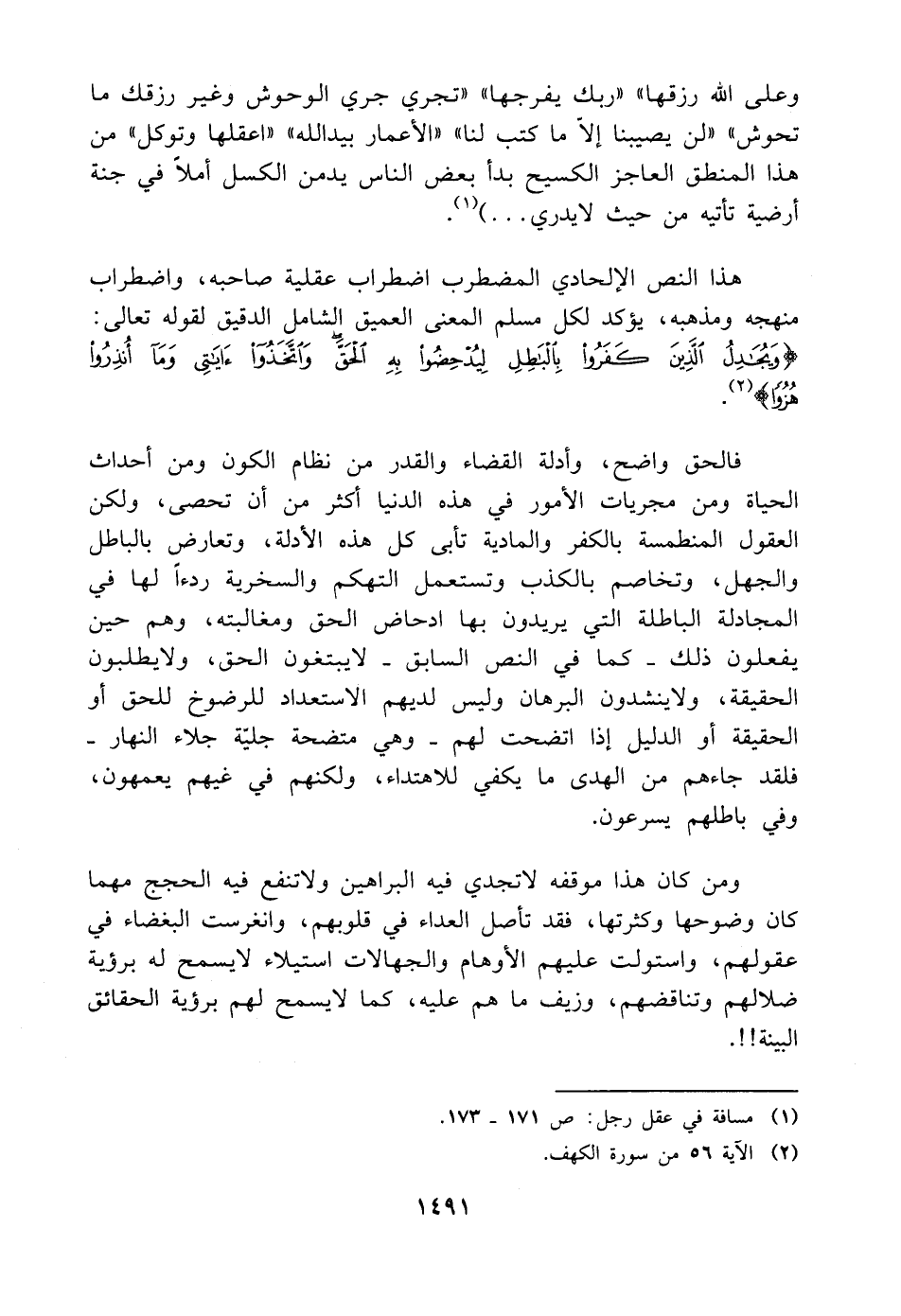 هذا النص الإلحادي المضطرب اضطراب عقلية صاحبه، واضطراب منهجه ومذهبه، يؤكد لكل مسلم المعنى العميق الشامل الدقيق لقوله تعالى: {وَيُجَادِلُ الَّذِينَ كَفَرُوا بِالْبَاطِلِ لِيُدْحِضُوا بِهِ الْحَقَّ وَاتَّخَذُوا آيَاتِي وَمَا أُنْذِرُوا هُزُوًا} (¬٢).