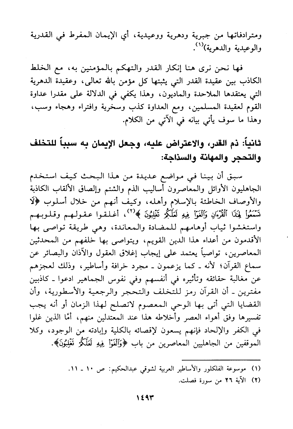 فها نحن نرى هنا إنكار القدر والتهكم بالمؤمنين به، مع الخلط الكاذب بين عقيدة القدر التي يثبتها كل مؤمن باللَّه تعالى، وعقيدة الدهرية التي يعتقدها الملاحدة والماديون، وهذا يكفي في الدلالة على مقدرا عداوة القوم لعقيدة المسلمين، ومع العداوة كذب وسخرية وافتراء وهجاء وسب، وهذا ما سوف يأتي بيانه في الآتي من الكلام.