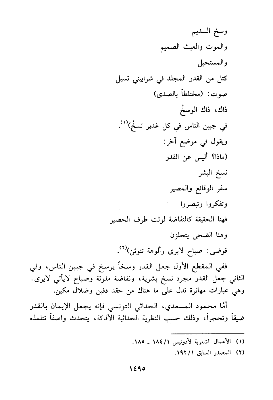 ففي المقطع الأول جعل القدر وسخًا يرسخ في جبين الناس، وفي الثاني جعل القدر مجرد نسخ بشرية، ونفاضة ملوثة وصباح لا يأتي لا يرى. وهي عبارات مهاترة تدل على ما هناك من حقد دفين وضلال مكين.