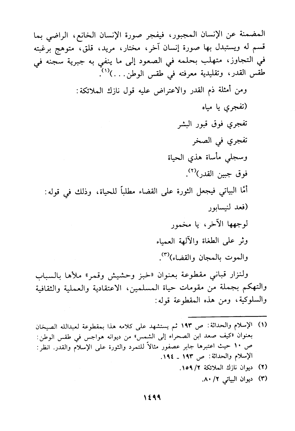 (¬١) الإسلام والحداثة: ص ١٩٣ ثم يستشهد على كلامه هذا بمقطوعة لعبد اللَّه الصيخان بعنوان "كيف صعد ابن الصحراء إلى الشمس" من ديوانه هواجس في طقس الوطن: ص ١٠ حيث اعتبرها جابر عصفور مثالًا للتمرد والثورة على الإسلام والقدر. انظر: الإسلام والحداثة: ص ١٩٣ - ١٩٤.