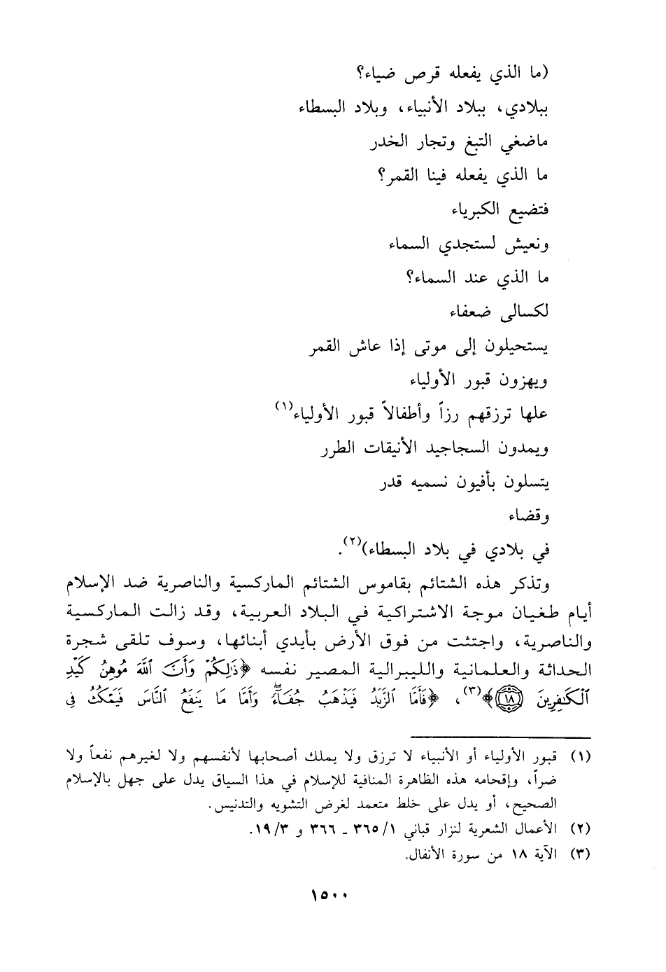 (¬١) قبور الأولياء أو الأنبياء لا ترزق ولا يملك أصحابها لأنفسهم ولا لغيرهم نفعًا ولا ضرًا، وإقحامه هذه الظاهرة المنافية للإسلام في هذا السياق يدل على جهل بالإسلام الصحيح، أو يدل على خلط متعمد لغرض التشويه والتدنيس.
