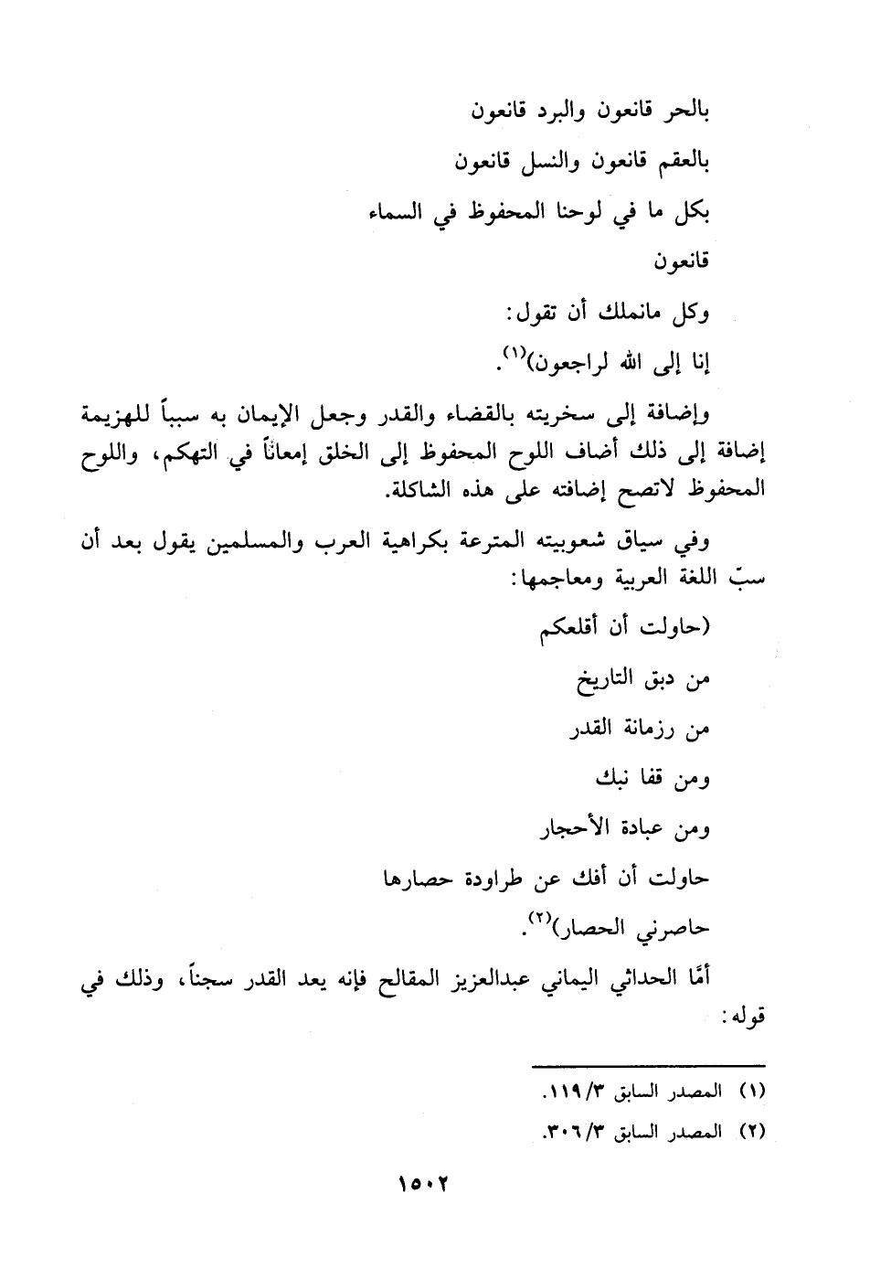 وإضافة إلى سخريته بالقضاء والقدر وجعل الإيمان به سببًا للهزيمة إضافة إلى ذلك أضاف اللوح المحفوظ إلى الخلق إمعانًا في التهكم، واللوح المحفوظ لا تصح إضافته على هذه الشاكلة.