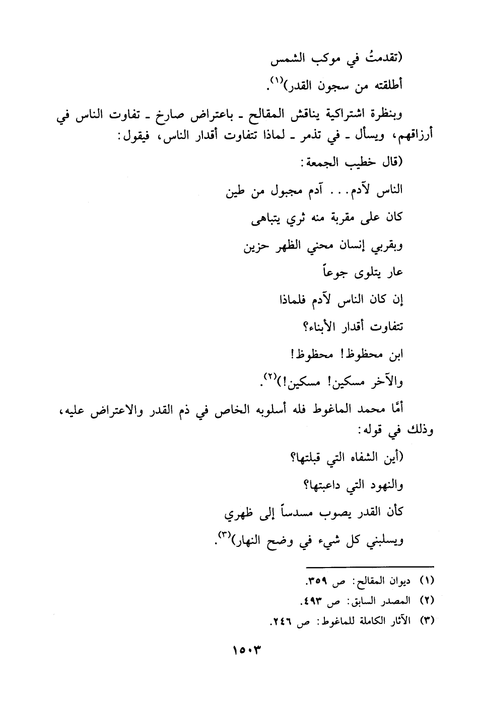 أمَّا محمد الماغوط فله أسلوبه الخاص في ذم القدر والاعتراض عليه، وذلك في قوله: