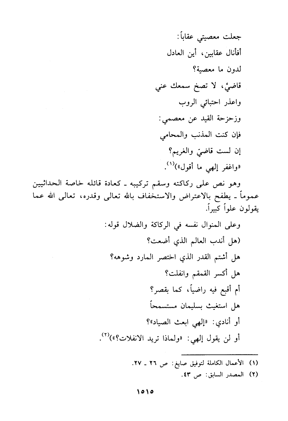 وهو نص على ركاكته وسقم تركيبه -كعادة قائله خاصة الحداثيين عمومًا- يطفح بالاعتراض والاستخفاف باللَّه تعالى وقدره، تعالى اللَّه عما يقولون علوًا كبيرًا.