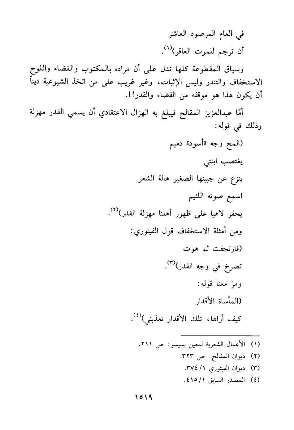 أمّا عبد العزيز المقالح فيبلغ به الهزال الاعتقادي أن يسمي القدر مهزلة وذلك في قوله: