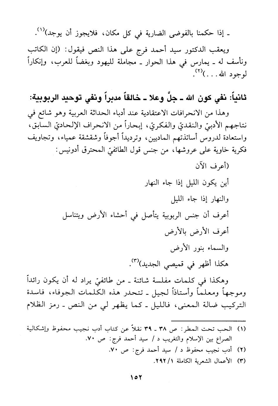 وهذا من الانحرافات الاعتقادية عند أدباء الحداثة العربية وهو شائع في نتاجهم الأدبيّ والنقديّ والفكريّ، إبحارًا من الانحراف الإلحاديّ السابق، واستعادة لدروس أساتذتهم الماديين، وترديدًا أجوفًا وشقشقة عمياء، وتجاويف فكرية خاوبة على عروشها، من جنس قول الطائفي المحترق أدونيس: