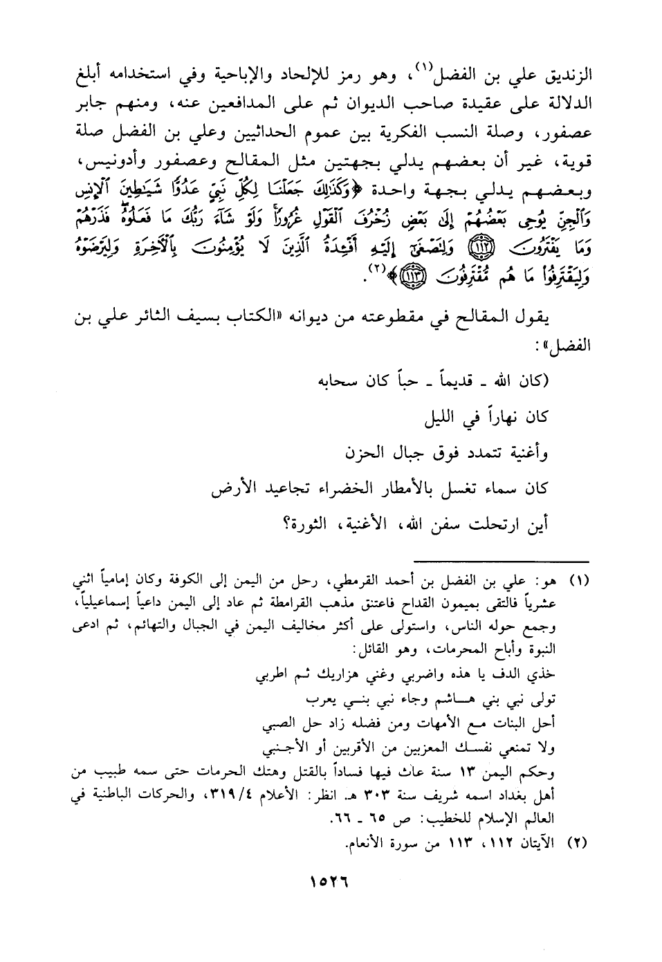 الزنديق علي بن الفضل (¬١)، وهو رمز للإلحاد والإباحية وفي استخدامه أبلغ الدلالة على عقيدة صاحب الديوان ثم على المدافعين عنه، ومنهم جابر عصفور، وصلة النسب الفكرية بين عموم الحداثيين وعلي بن الفضل صلة قوية، غير أن بعضهم يدلي بجهتين مثل المقالح وعصفور وأدونيس، وبعضهم يدلي بجهة واحدة {وَكَذَلِكَ جَعَلْنَا لِكُلِّ نَبِيٍّ عَدُوًّا شَيَاطِينَ الْإِنْسِ وَالْجِنِّ يُوحِي بَعْضُهُمْ إِلَى بَعْضٍ زُخْرُفَ الْقَوْلِ غُرُورًا وَلَوْ شَاءَ رَبُّكَ مَا فَعَلُوهُ فَذَرْهُمْ وَمَا يَفْتَرُونَ (١١٢) وَلِتَصْغَى إِلَيْهِ أَفْئِدَةُ الَّذِينَ لَا يُؤْمِنُونَ بِالْآخِرَةِ وَلِيَرْضَوْهُ وَلِيَقْتَرِفُوا مَا هُمْ مُقْتَرِفُونَ (١١٣)} (¬٢).