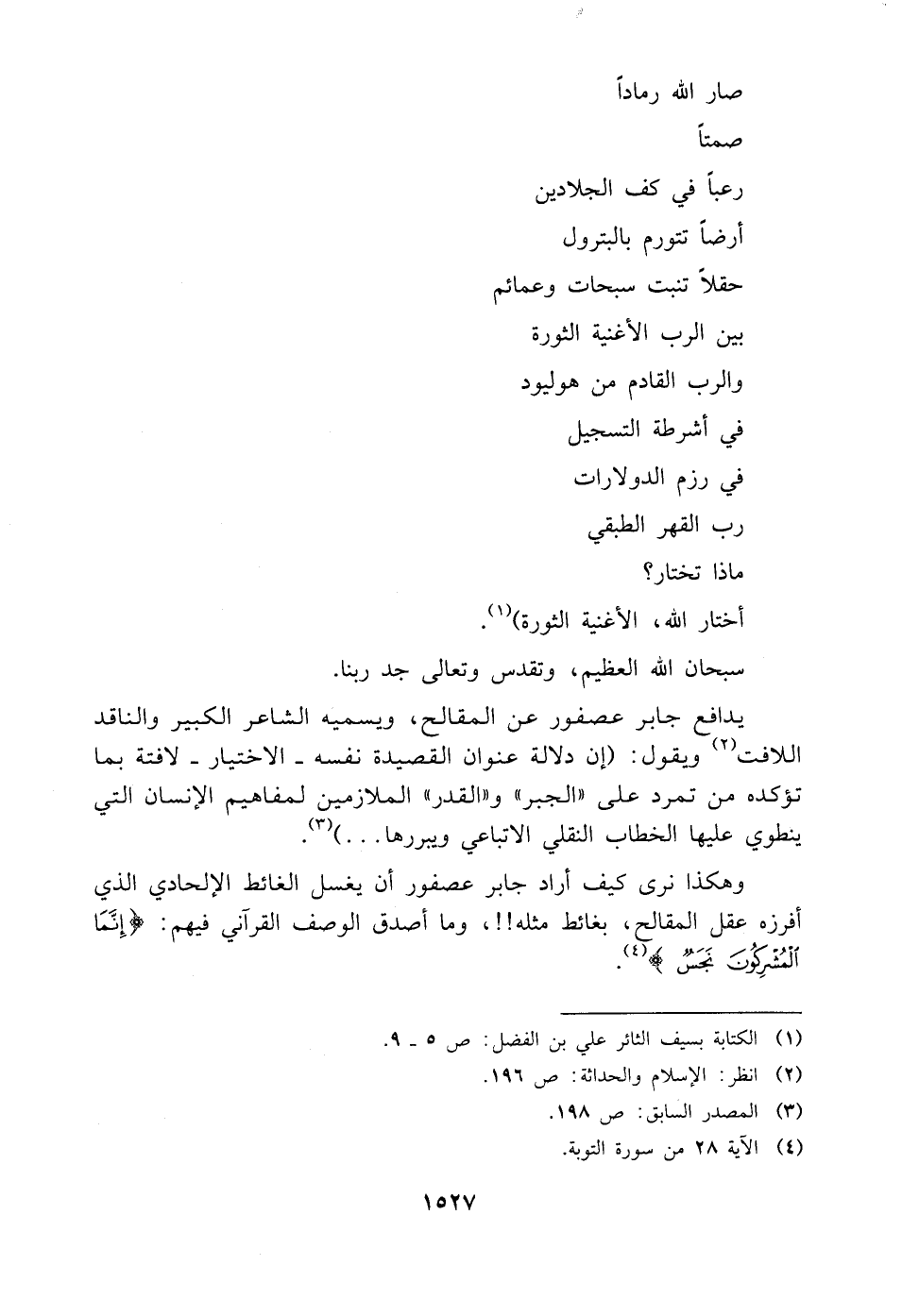 وهكذا نرى كيف أراد جابر عصفور أن يغسل الغائط الإلحادي الذي أفرزه عقل المقالح، بغائط مثله! ! ، وما أصدق الوصف القرآني فيهم: {يَاأَيُّهَا الَّذِينَ آمَنُوا إِنَّمَا الْمُشْرِكُونَ نَجَسٌ} (¬٤).
