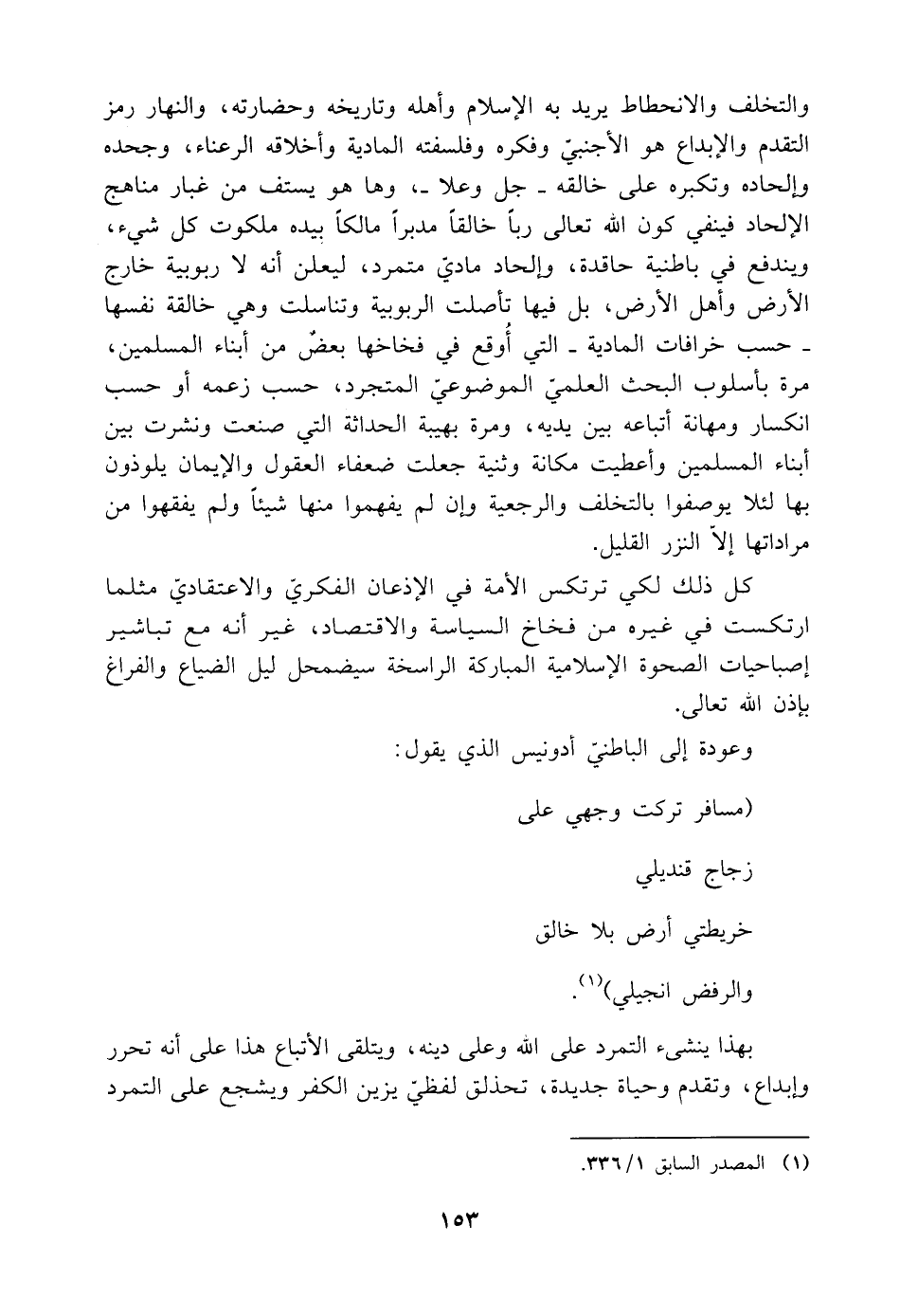 والتخلف والانحطاط يريد به الإسلام وأهله وتاريخه وحضارته، والنهار رمز التقدم والإبداع هو الأجنبي وفكره وفلسفته المادية وأخلاقه الرعناء، وجحده وإلحاده وتكبره على خالقه -جل وعلا-، وها هو يستف من غبار مناهج الإلحاد فينفي كون اللَّه تعالى ربًا خالقًا مدبرًا مالكًا بيده ملكوت كل شيء، ويندفع في باطنية حاقدة، وإلحاد ماديّ متمرد، ليعلن أنه لا ربوبية خارج الأرض وأهل الأرض، بل فيها تأصلت الربوبية وتناسلت وهي خالقة نفسها -حسب خرافات المادية- التي أُوقع في فخاخها بعضٌ من أبناء المسلمين، مرة بأسلوب البحث العلمي الموضوعيّ المتجرد، حسب زعمه أو حسب انكسار ومهانة أتباعه بين يديه، ومرة بهيبة الحداثة التي صنعت ونشرت بين أبناء المسلمين وأعطيت مكانة وثنية جعلت ضعفاء العقول والإيمان يلوذون بها لئلا يوصفوا بالتخلف والرجعية وإن لم يفهموا منها شيئًا ولم يفقهوا من مراداتها إلّا النزر القليل.