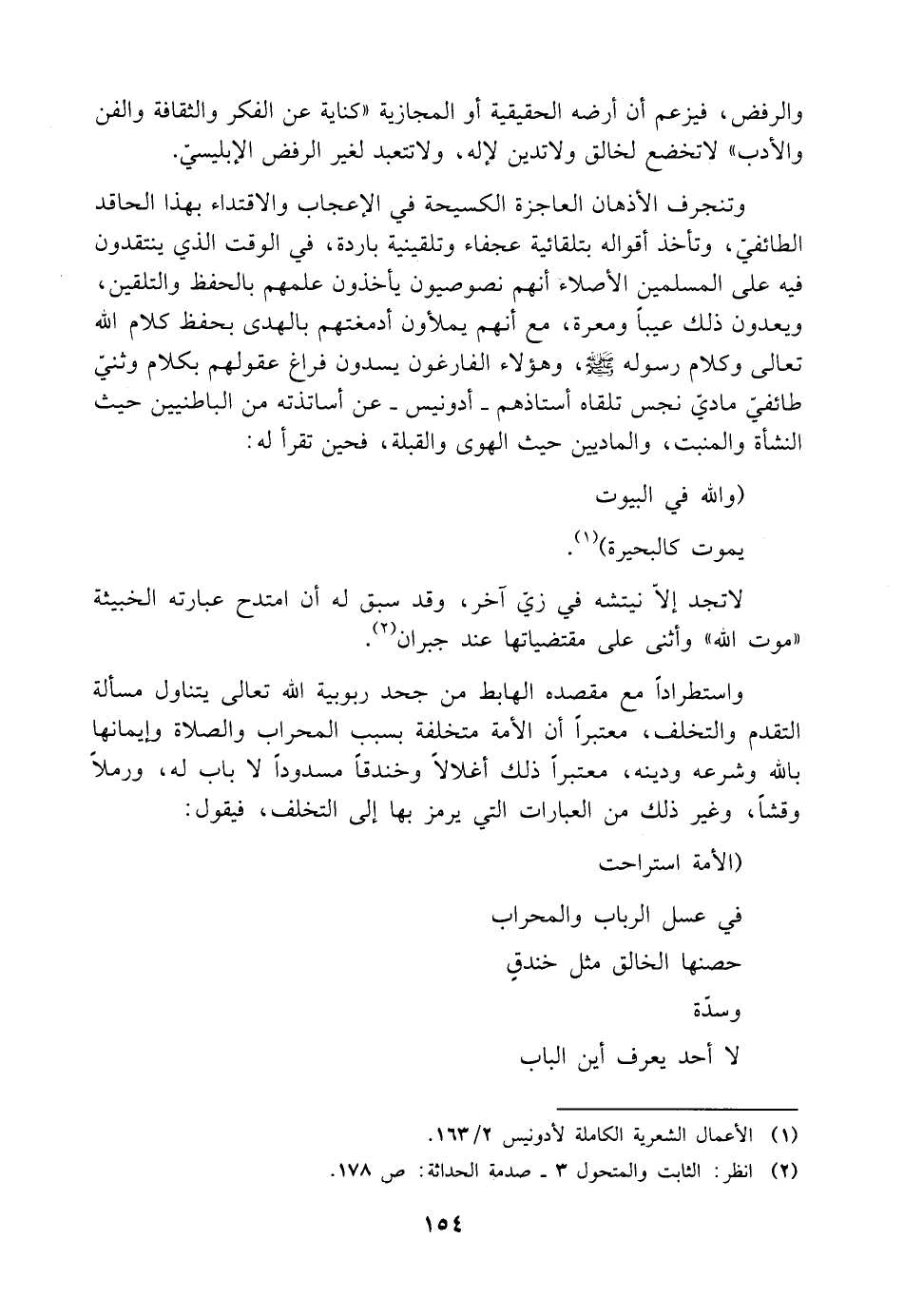 وتنجرف الأذهان العاجزة الكسيحة في الإعجاب والاقتداء بهذا الحاقد الطائفيّ، وتأخذ أقواله بتلقائية عجفاء وتلقينية باردة، في الوقت الذي ينتقدون فيه على المسلمين الأصلاء أنهم نصوصيون يأخذون علمهم بالحفظ والتلقين، ويعدون ذلك عيبًا ومعرة، مع أنهم يملأون أدمغتهم بالهدى بحفظ كلام اللَّه تعالى وكلام رسوله -صلى اللَّه عليه وسلم-، وهؤلاء الفارغون يسدون فراغ عقولهم بكلام وثنيّ طائفيّ ماديّ نجس تلقاه أستاذهم -أدونيس- عن أساتذته من الباطنيين حيث النشأة والمنبت، والماديين حيث الهوى والقبلة، فحين تقرأ له: