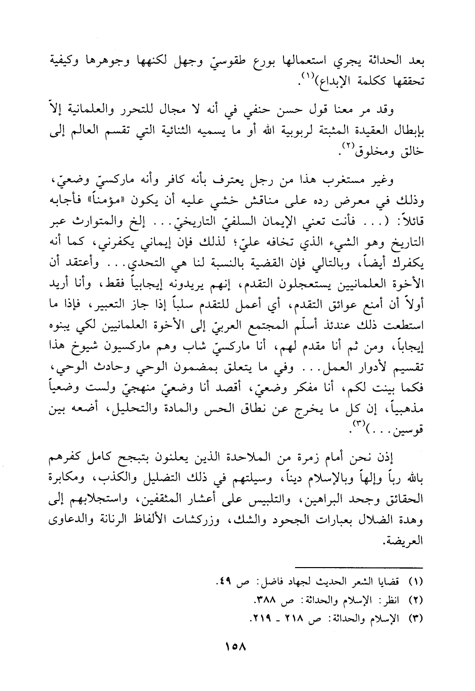 وقد مر معنا قول حسن حنفي في أنه لا مجال للتحرر والعلمانية إلّا بإبطال العقيدة المثبتة لربوبية اللَّه أو ما يسميه الثنائية التي تقسم العالم إلى خالق ومخلوق (¬٢).