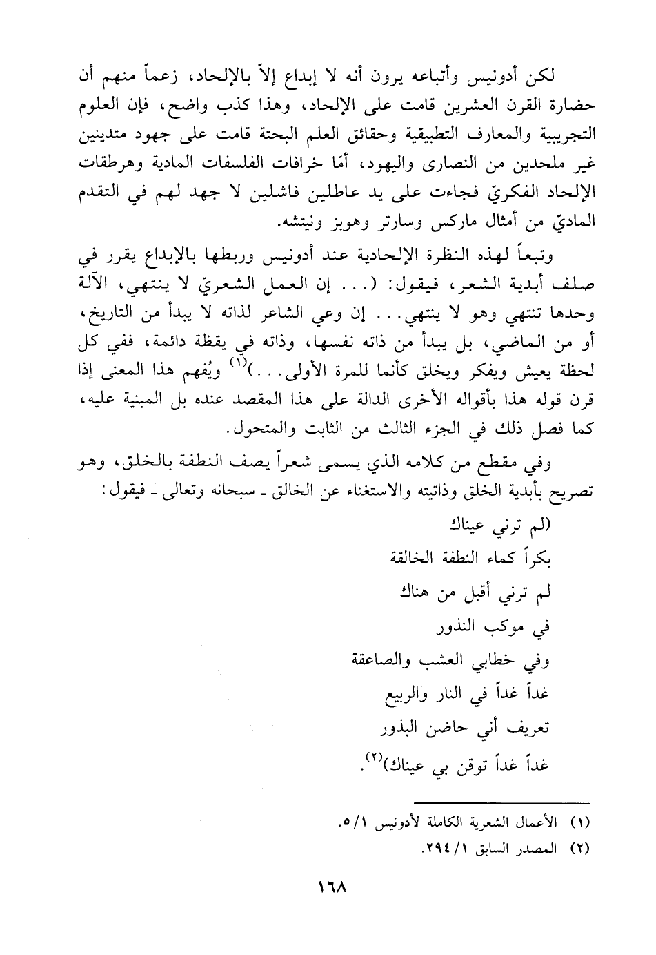 لكن أدونيس وأتباعه يرون أنه لا إبداع إلّا بالإلحاد، زعمًا منهم أن حضارة القرن العشرين قامت على الإلحاد، وهذا كذب واضح، فإن العلوم التجريبية والمعارف التطبيقية وحقائق العلم البحتة قامت على جهود متدينين غير ملحدين من النصارى واليهود، أمّا خرافات الفلسفات المادية وهرطقات الإلحاد الفكريّ فجاءت على يد عاطلين فاشلين لا جهد لهم في التقدم الماديّ من أمثال ماركس وسارتر وهوبز ونيتشه.