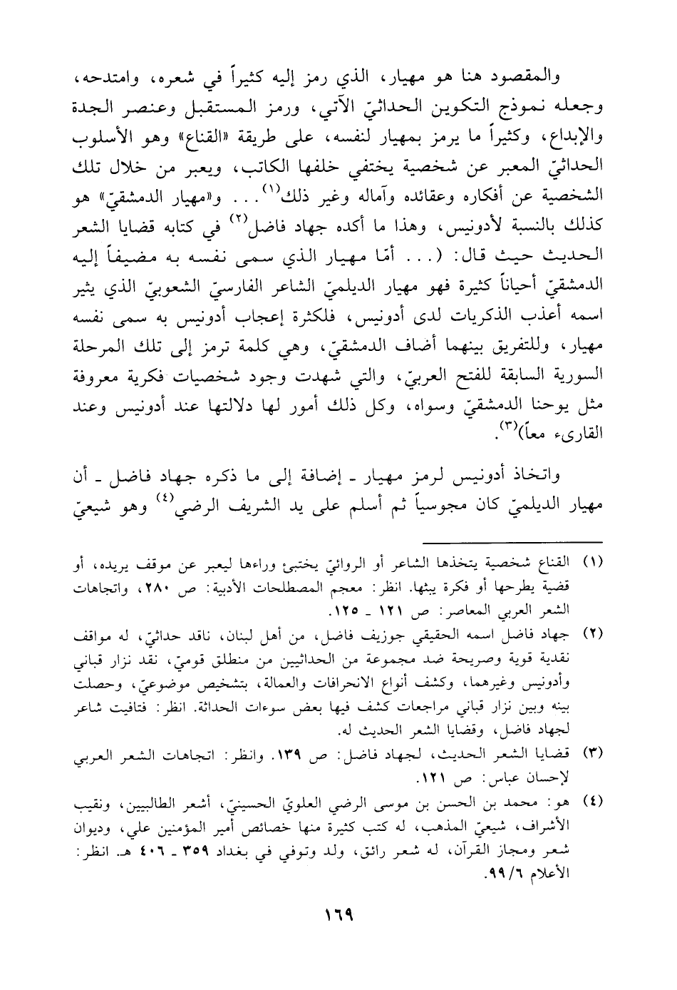واتخاذ أدونيس لرمز مهيار -إضافة إلى ما ذكره جهاد فاضل- أن مهيار الديلميّ كان مجوسيًا ثم أسلم على يد الشريف الرضي (¬٤) وهو شيعيّ