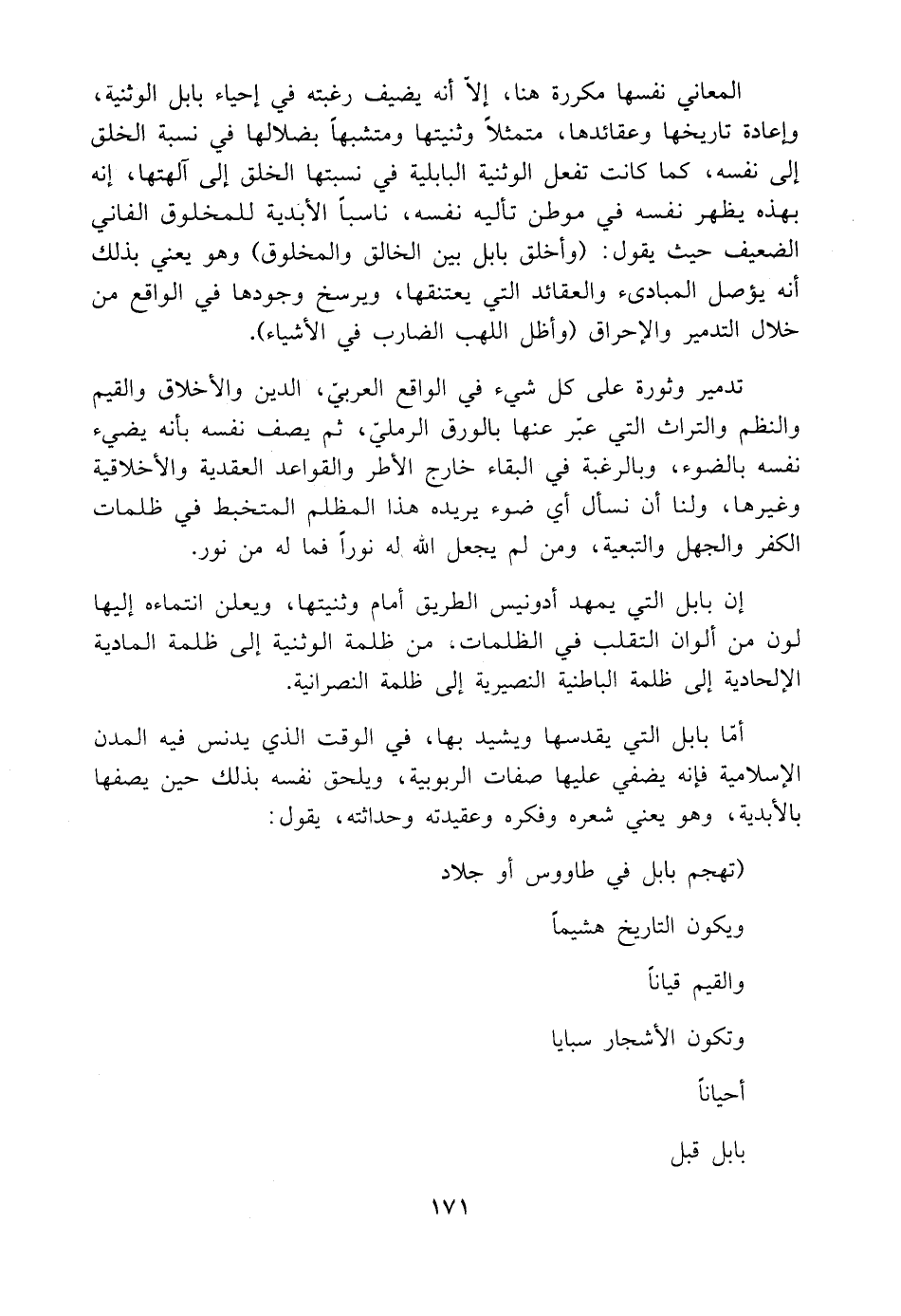 إن بابل التي يمهد أدونيس الطريق أمام وثنيتها، ويعلن انتماءه إليها لون من ألوان التقلب في الظلمات، من ظلمة الوثنية إلى ظلمة المادية الإلحادية إلى ظلمة الباطنية النصيرية إلى ظلمة النصرانية.