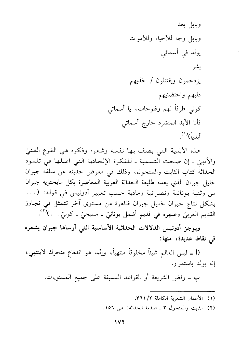 هذه الأبدية التي يصف بها نفسه وشعره وفكره هي الفرع الفنيّ والأدبيّ -إن صحت التسمية- للفكرة الإلحادية التي أصلها في تلمود الحداثة كتاب الثابت والمتحول، وذلك في معرض حديثه عن سلفه جبران خليل جبران الذي يعده طليعة الحداثة العربية المعاصرة بكل ما يحتويه جبران من وثنية يونانية ونصرانية ومادية حسب تعبير أدونيس في قوله: (. . . يشكل نتاج جبران خليل جبران ظاهرة من مستوى آخر تتمثل في تجاوز القديم العربيّ وصهره في قديم أشمل يونانيّ -مسيحي- كونيّ. . .) (¬٢).