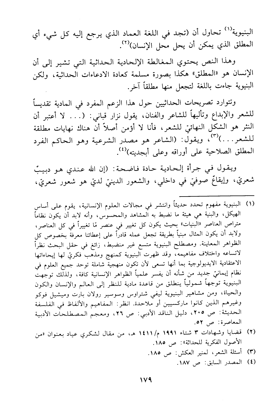 (¬١) البنيوية مفهوم تحدد حديثًا وانتشر في مجالات العلوم الإنسانية، يقوم على أساس الهيكل، والبنية هي هيئة ما نضبط به المشاهد والمحسوس، وأنه لابد أن يكون نظامًا متراص العناصر "البنيات" بحيث يكون كل تغيير في عنصر مّا تغييرًا في كل العناصر، ولابد أن يكون المثال مبنيًا بطريقة تجعل عمله قادرًا على إعطائنا معرفة بخصوص كل الظواهر المعاينة. ومصطلح البنيوية متسع غير منضبط، زائغ في حقل البحث نظرًا لاتساعه واختلاف مفاهيمه، وقد ظهرت البنيوية كمنهج ومذهب فكريّ لها إيحاءاتها الاعتقادية الايديولوجية بما أنها تسعى لأن تكون منهجية شاملة توحد جميع العلوم في نظام إيمانيّ جديد من شأنه أن يفسر علميًا الظواهر الإنسانية كافة، ولذلك توجهت البنيوية توجهًا شموليًا ينطلق من قاعدة مادية للنظر إلى العالم والإنسان والكون والحياة، ومن مشاهير البنيوية ليفي شتراوس وسوسير رولان بارت وميشيل فوكو وغيرهم الذين كانوا ماركسيين أو ملاحدة. انظر: المفاهيم والألفاظ في الفلسفة الحديثة: ص ٢٠٥، دليل الناقد الأدبي: ص ٢٦، ومعجم المصطلحات الأدبية المعاصرة: ص ٥٢.