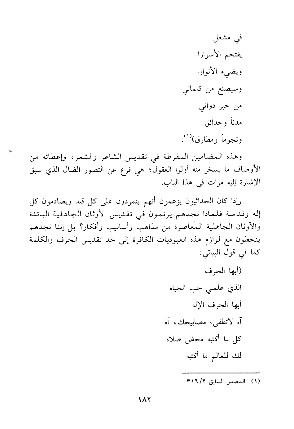وإذا كان الحداثيون يزعمون أنهم يتمردون على كل قيد ويصادمون كل إله وقداسة فلماذا نجدهم يرتمون في تقديس الأوثان الجاهلية البائدة والأوثان الجاهلية المعاصرة من مذاهب وأساليب وأفكار؟ بل إننا نجدهم ينحطون مع لوازم هذه العبوديات الكافرة إلى حد تقديس الحرف والكلمة كما في قول البياتيّ: