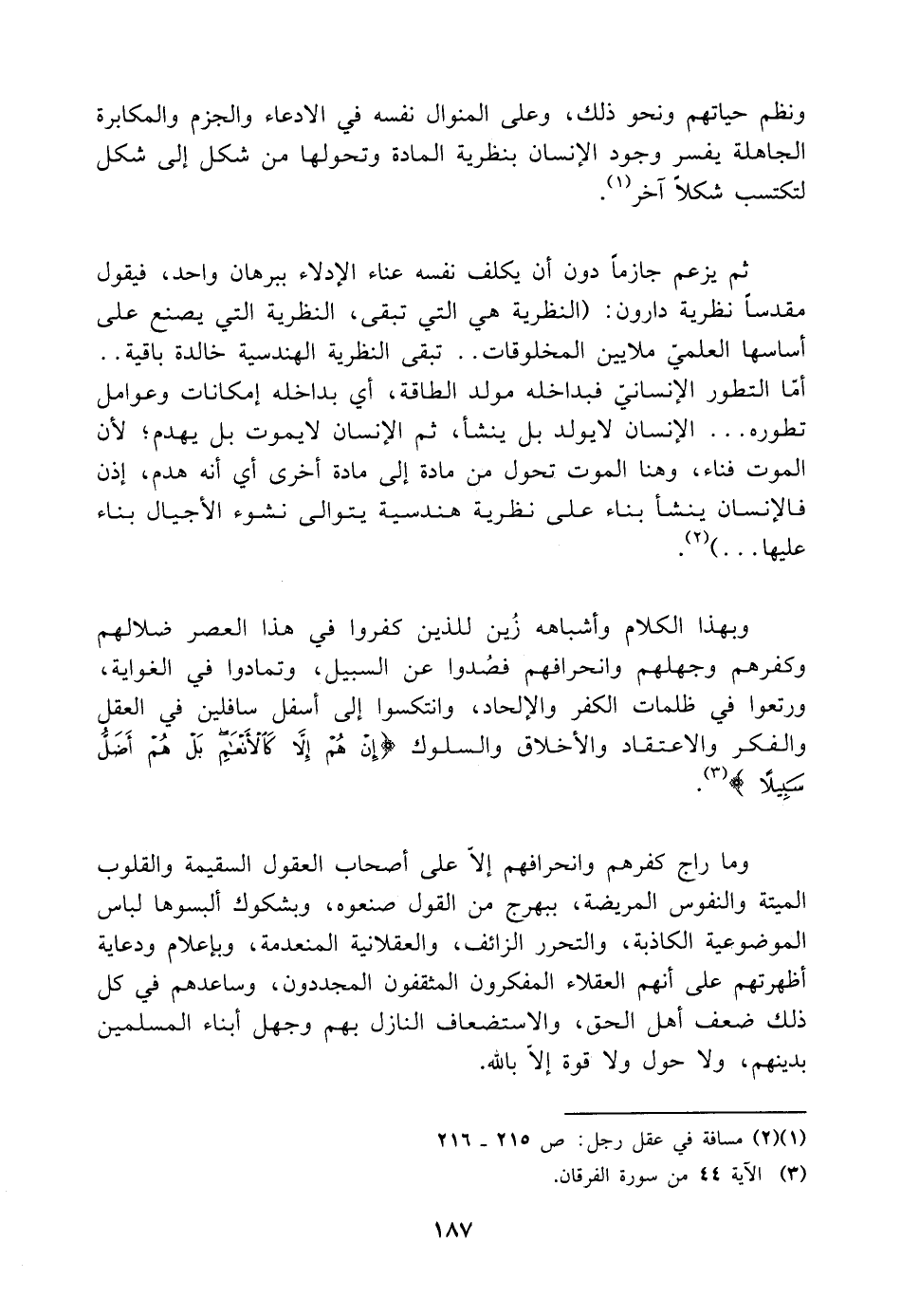 ونظم حياتهم ونحو ذلك، وعلى المنوال نفسه في الادعاء والجزم والمكابرة الجاهلة يفسر وجود الإنسان بنظرية المادة وتحولها من شكل إلى شكل لتكتسب شكلًا آخر (¬١).