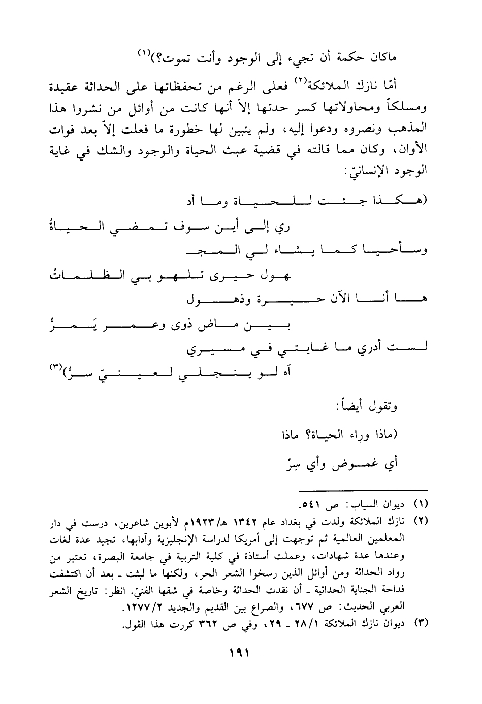أمّا نازك الملائكة (¬٢) فعلى الرغم من تحفظاتها على الحداثة عقيدة ومسلكًا ومحاولاتها كسر حدتها إلّا أنها كانت من أوائل من نشروا هذا المذهب ونصروه ودعوا إليه، ولم يتبين لها خطورة ما فعلت إلّا بعد فوات الأوان، وكان مما قالته في قضية عبث الحياة والوجود والشك في غاية الوجود الإنسانيّ: