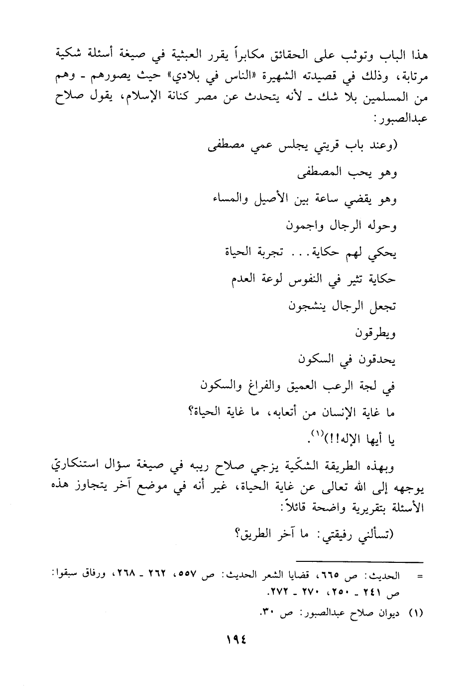 هذا الباب وتوثب على الحقائق مكابرًا يقرر العبثية في صيغة أسئلة شكية مرتابة، وذلك في قصيدته الشهيرة "الناس في بلادي" حيث يصورهم -وهم من المسلمين بلا شك- لأنه يتحدث عن مصر كنانة الإسلام، يقول صلاح عبد الصبور: